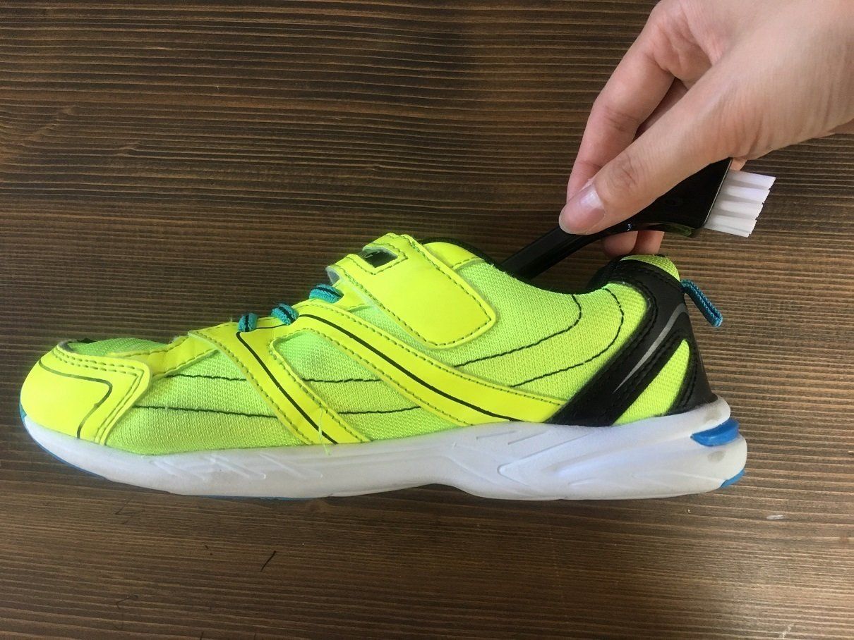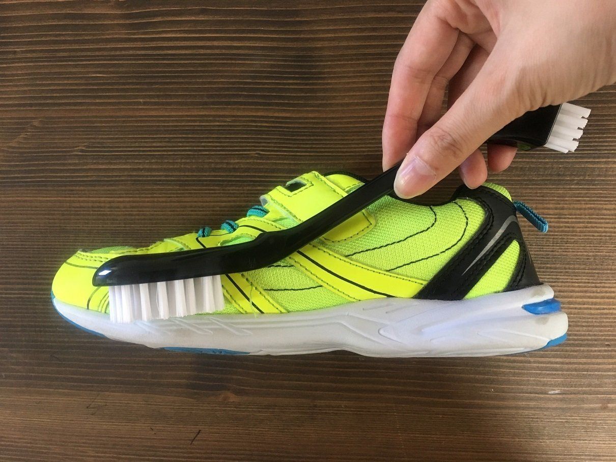 またカーブ具合が絶妙で、写真のように奥までしっかりと洗いやすい。細かな部分は、小さい方のブラシを使うとより汚れが落ちやすいです。靴底の溝まで洗えておすすめです。コンパクトなので、子どもが自分で使うときも持ちやすいですよ。