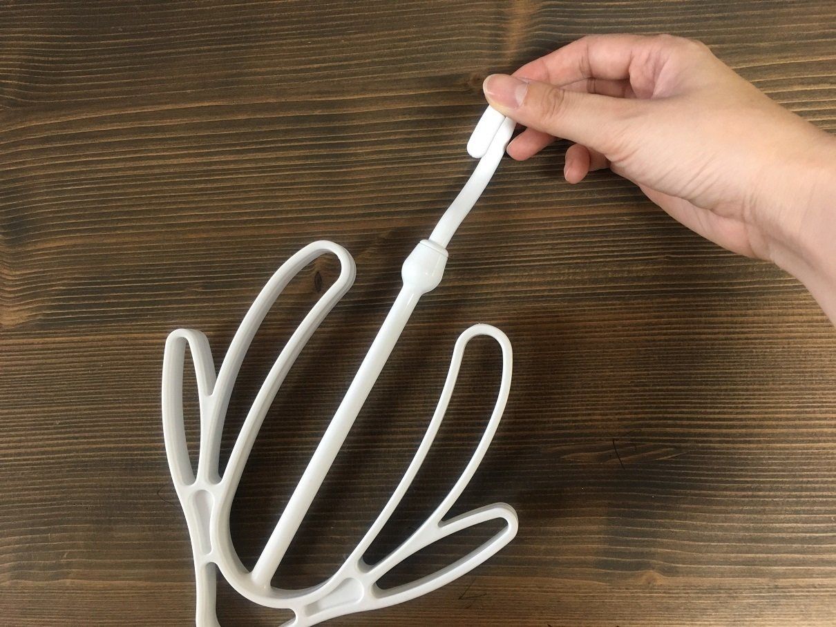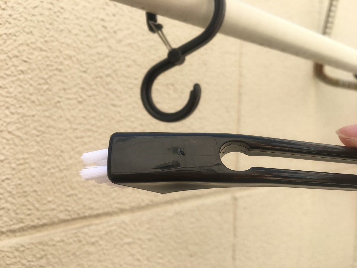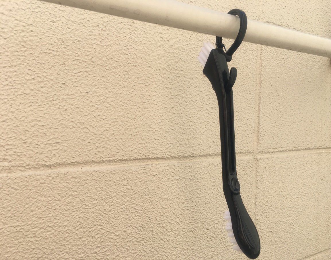 ちなみにこのブラシは中央に穴が空いているので、ここにフックなどを通して引っかけておくことも可能。写真のようにS字フックを使って、すぐ使えるようにスタンバイしておきましょう。