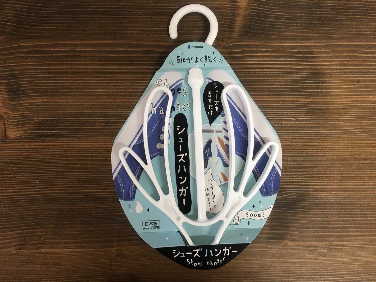 こちらも100均で購入できるシューズハンガー(価格100円)。フックの部分がクルッと一回転するので、どんな所にもかけやすいつくりになっています。