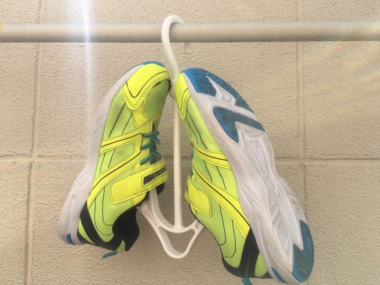 子どものスニーカーを干してみました。写真のように、干した際に少し斜めになるのがポイント!斜めになることで、かかとの部分に水が溜まるのを防ぎ、乾きやすくなるのです。もし、靴紐を別で干したいときは、下の連結部分に引っかけることも可能ですよ。