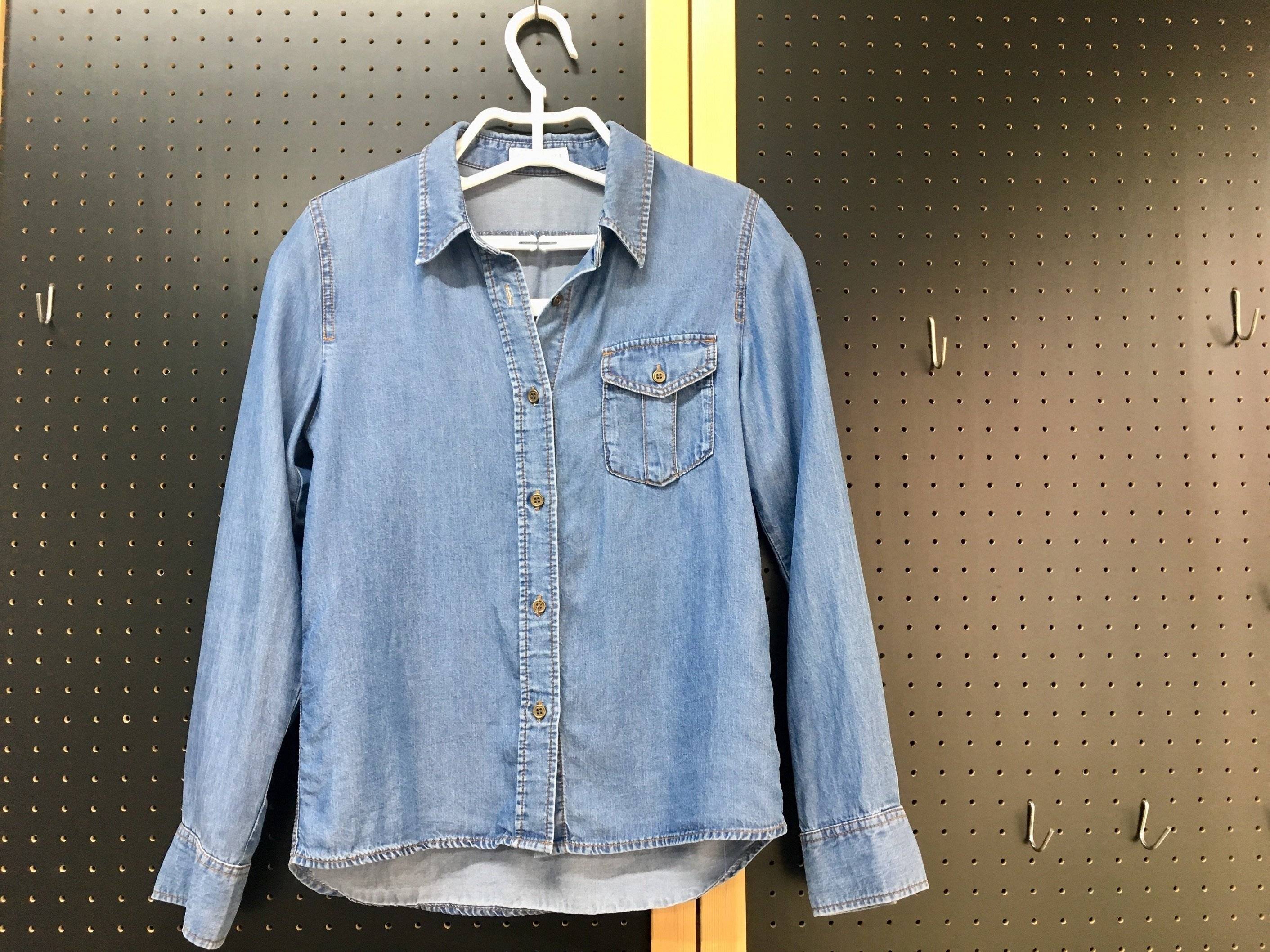 伸ばさない状態では幅40cmなので、女性のS〜Lサイズのお洋服をかけるのにちょうどいいサイズ感。写真はMサイズのシャツをかけたところです。男性物の服を干したいときは、数cm伸ばせばOK。