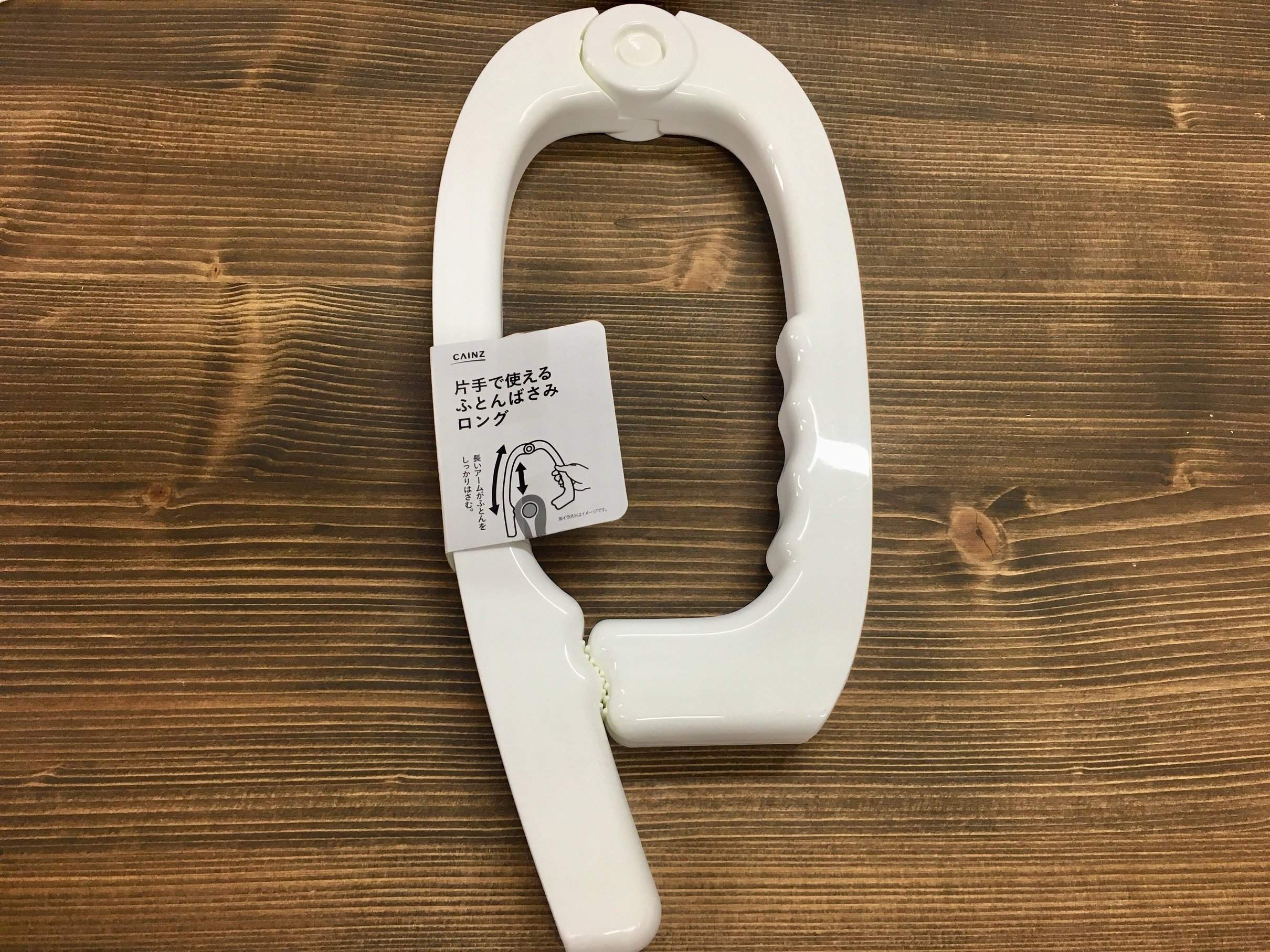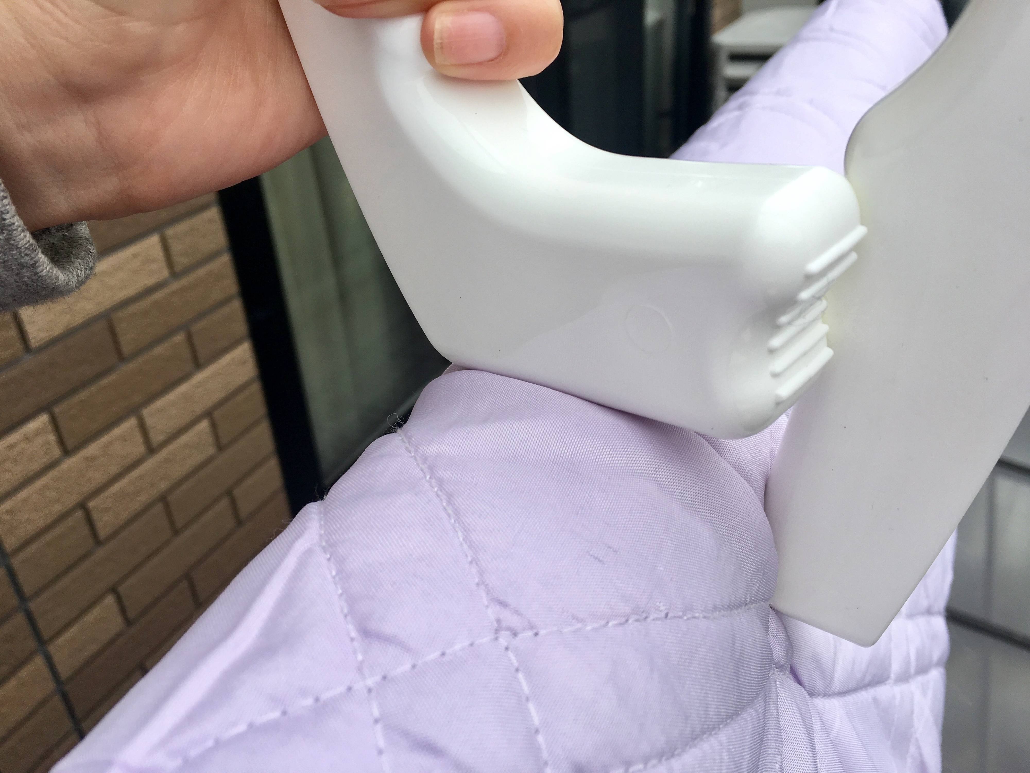 布団を干すのは重労働だから、少しでもラクなほうがいいですよね。この布団ばさみは文字通り、片手でもはさめまる構造。長く出ている部分を布団に引っ掛けて、そのまま反対側に引っ張ると簡単にはさめます。