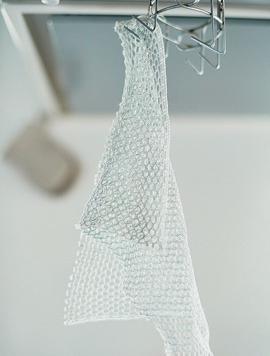 スポンジをやめて速乾性の網たわしに。つるし収納で、雑菌の繁殖防止にも。食器洗いのついでに同じ網たわしでシンクも洗えば、2個用意しなくてもOK。
