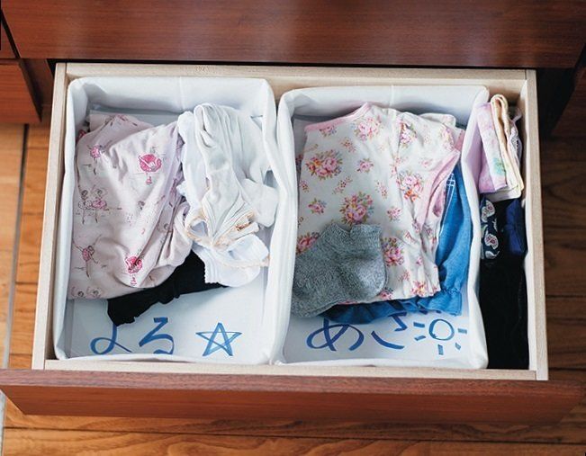 子どもが自分で身支度ができるよう、ひと工夫。引き出しを仕切って、朝と夜の着替えを1セットずつ収納。