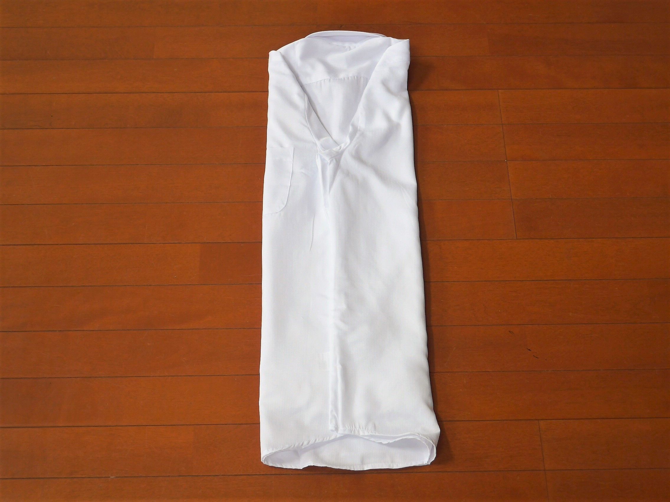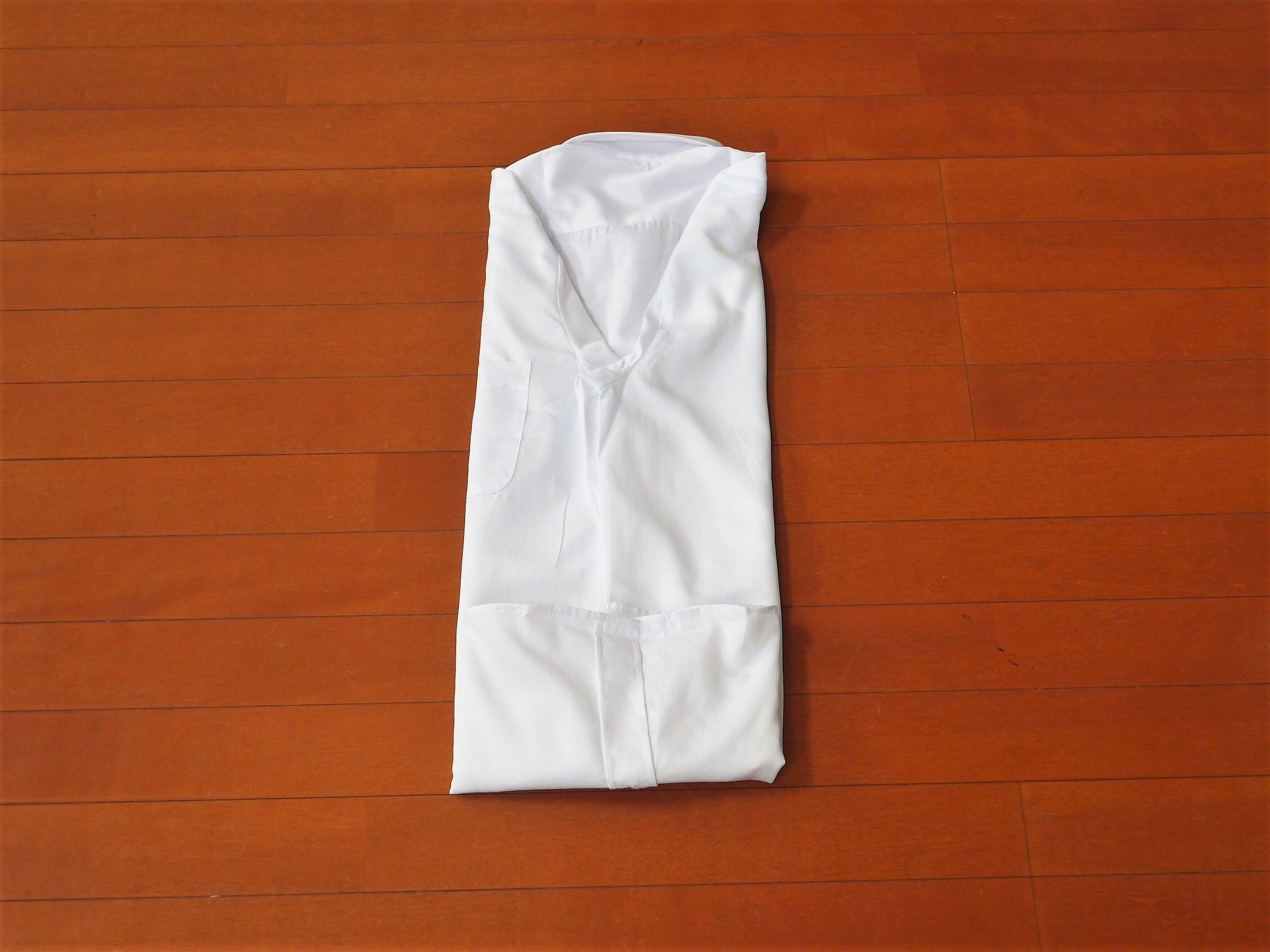 6.そのままさらに二つ折りにし、すそ部分をそで下に折り込みます。