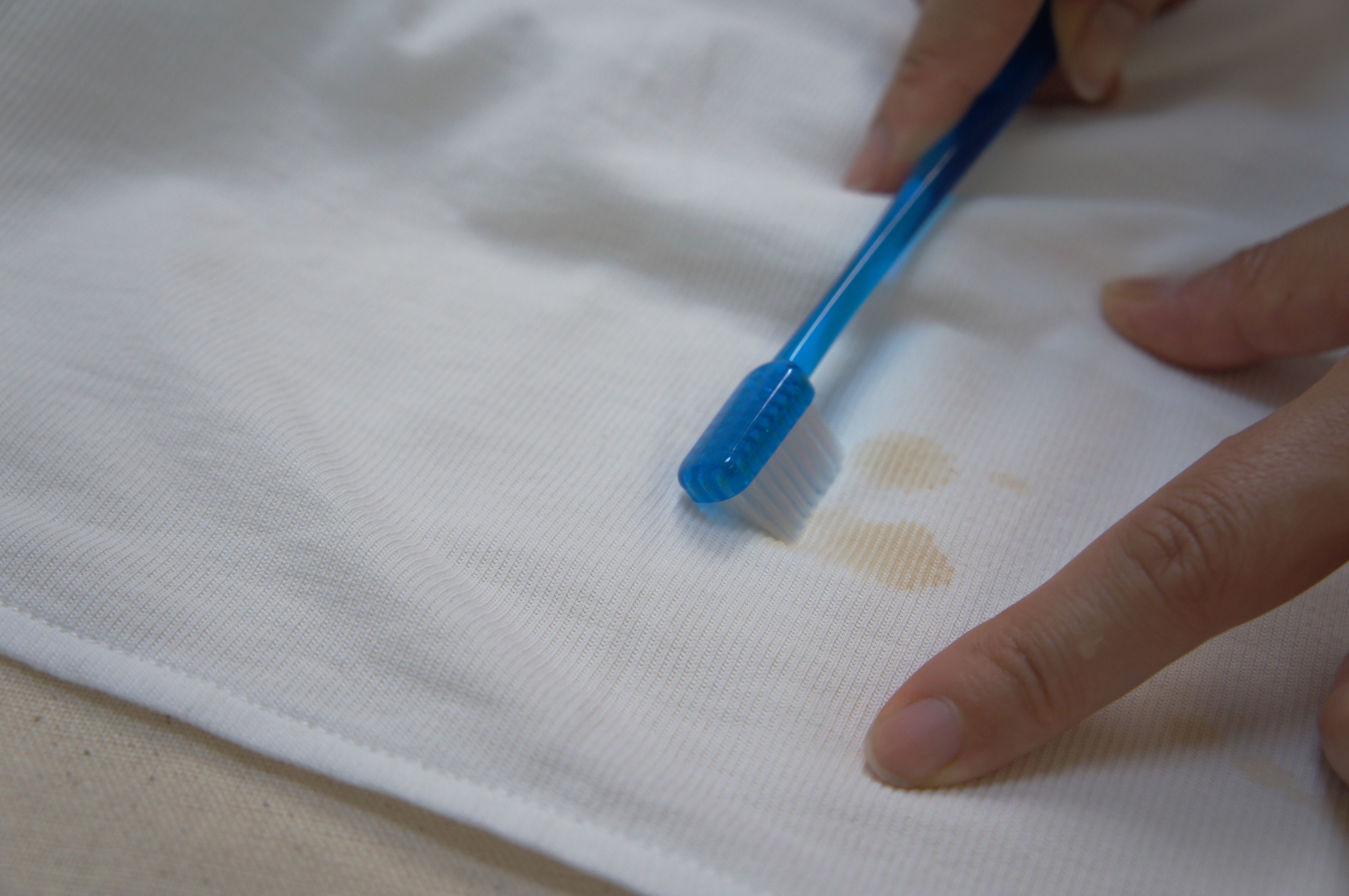 1で落ちない場合は、台所用洗剤をつけた歯ブラシでたたき、下に敷いたあて布にシミを移します。