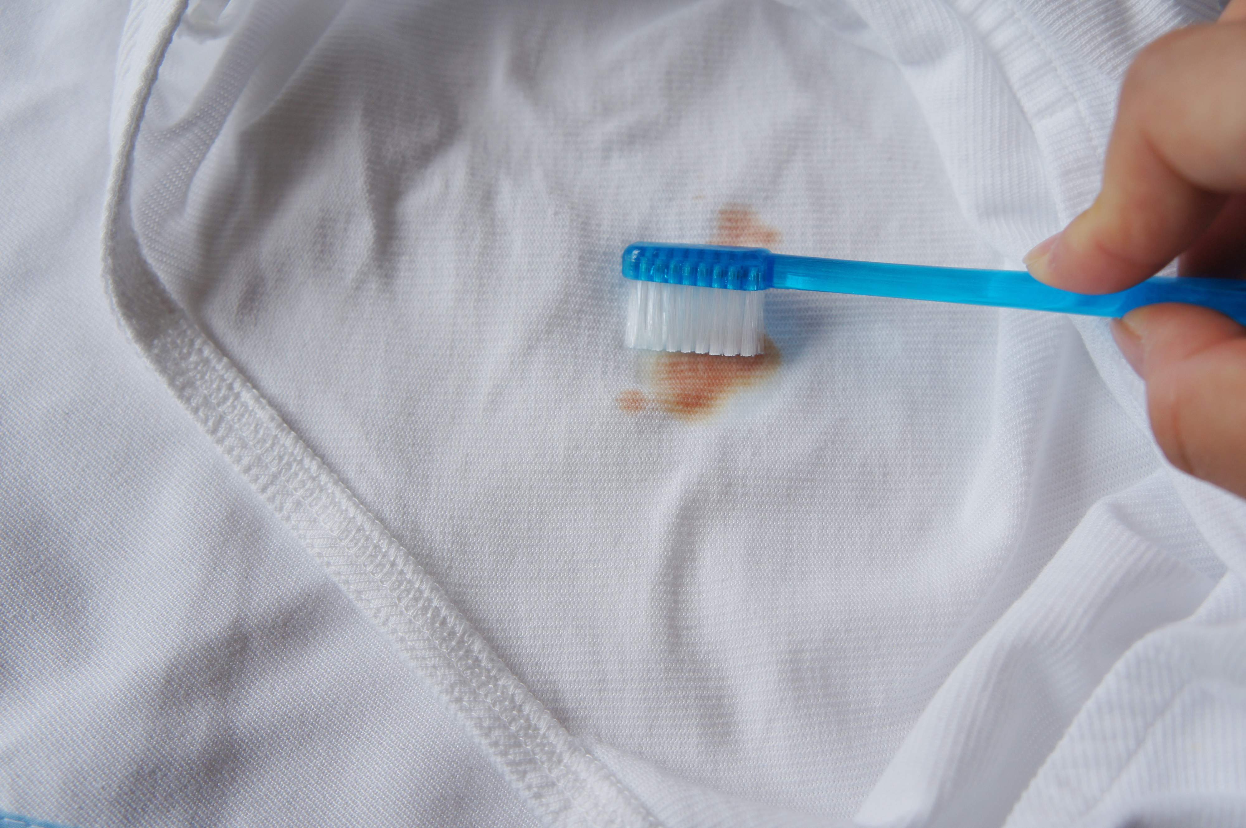 1の方法で落ちない場合は、台所用洗剤をつけた歯ブラシでトントンとたたき、下に敷いたあて布にシミを移します。