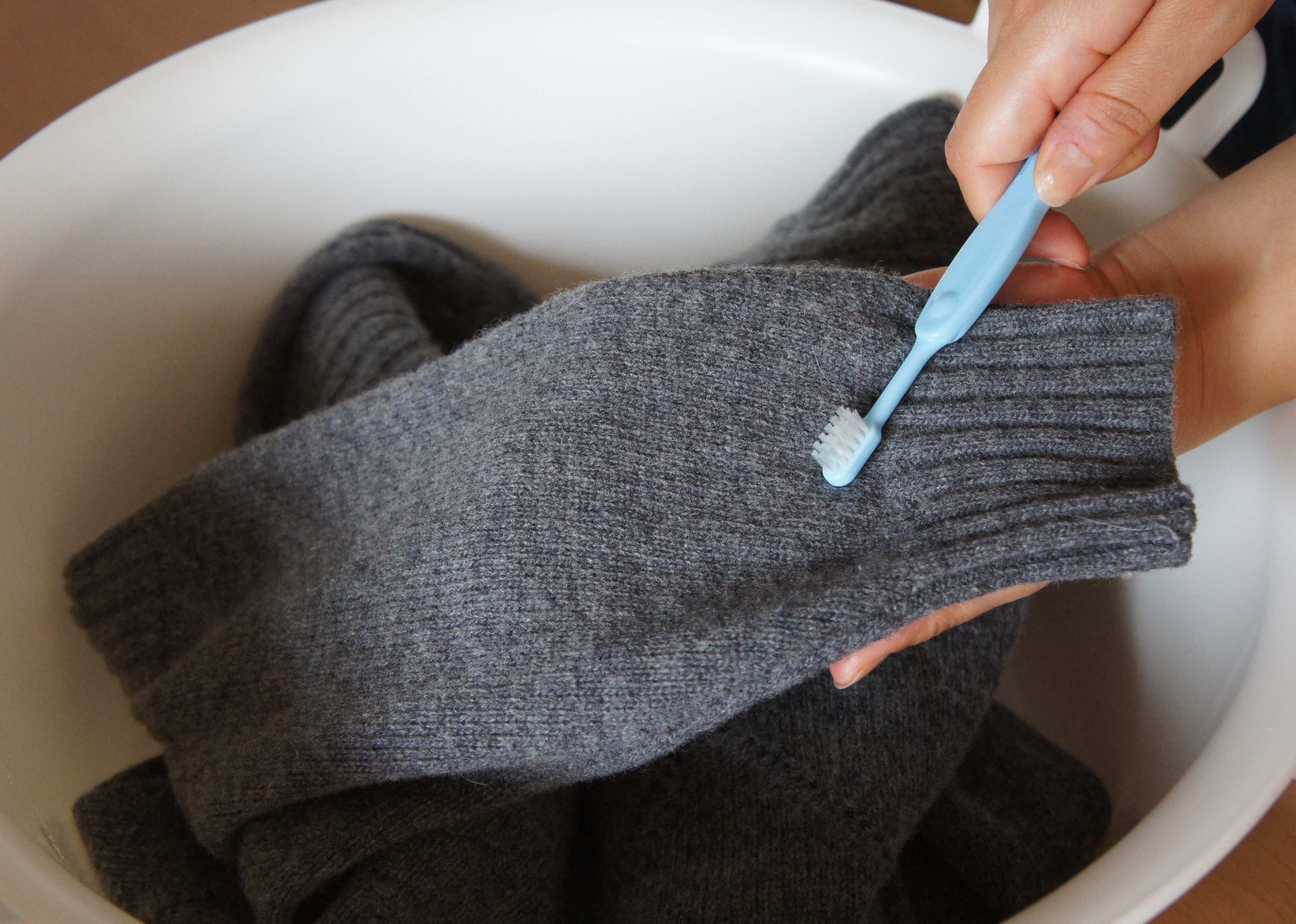 汚れている部分に洗剤をつけ、歯ブラシの背でたたいて染み込ませます。