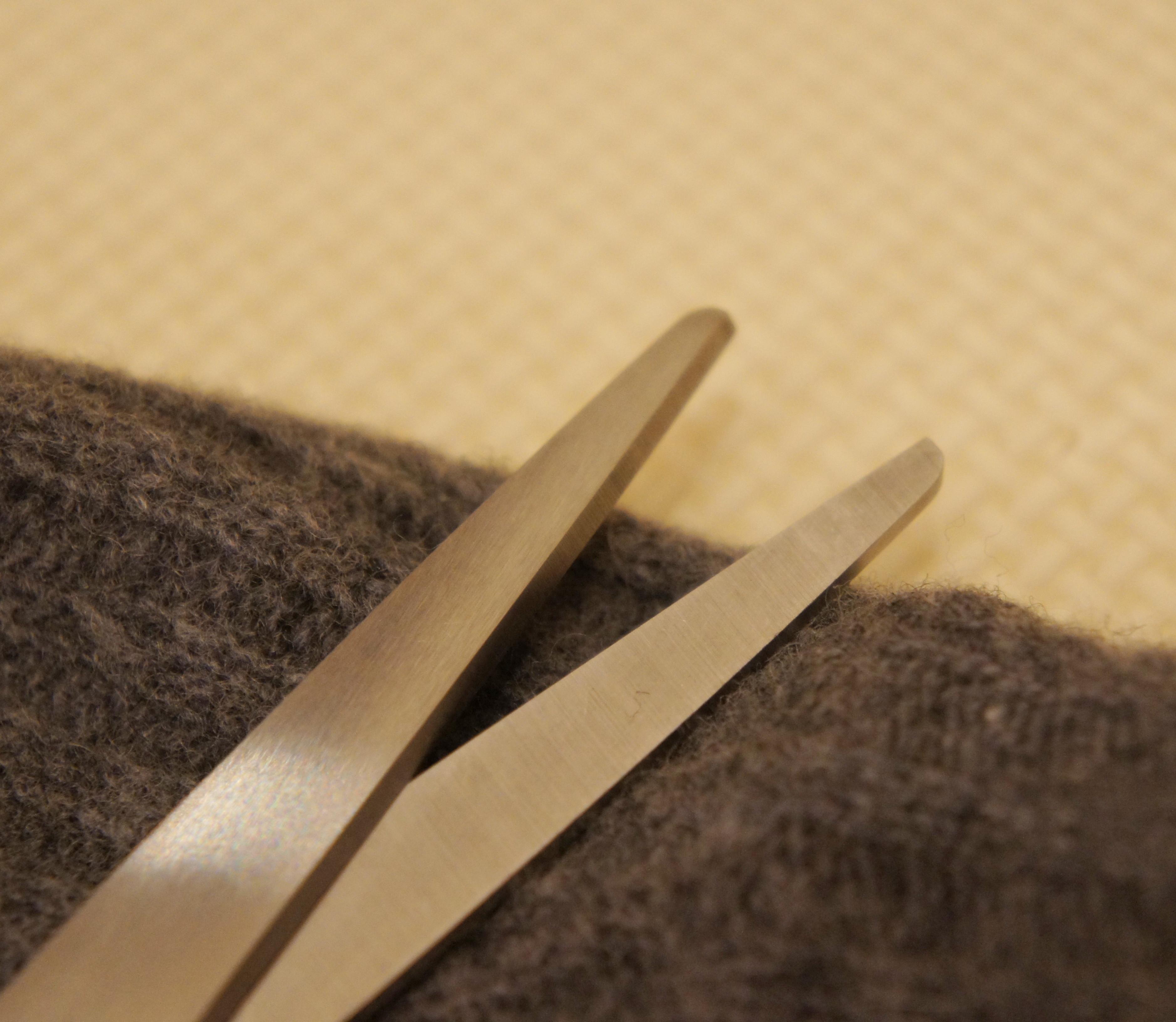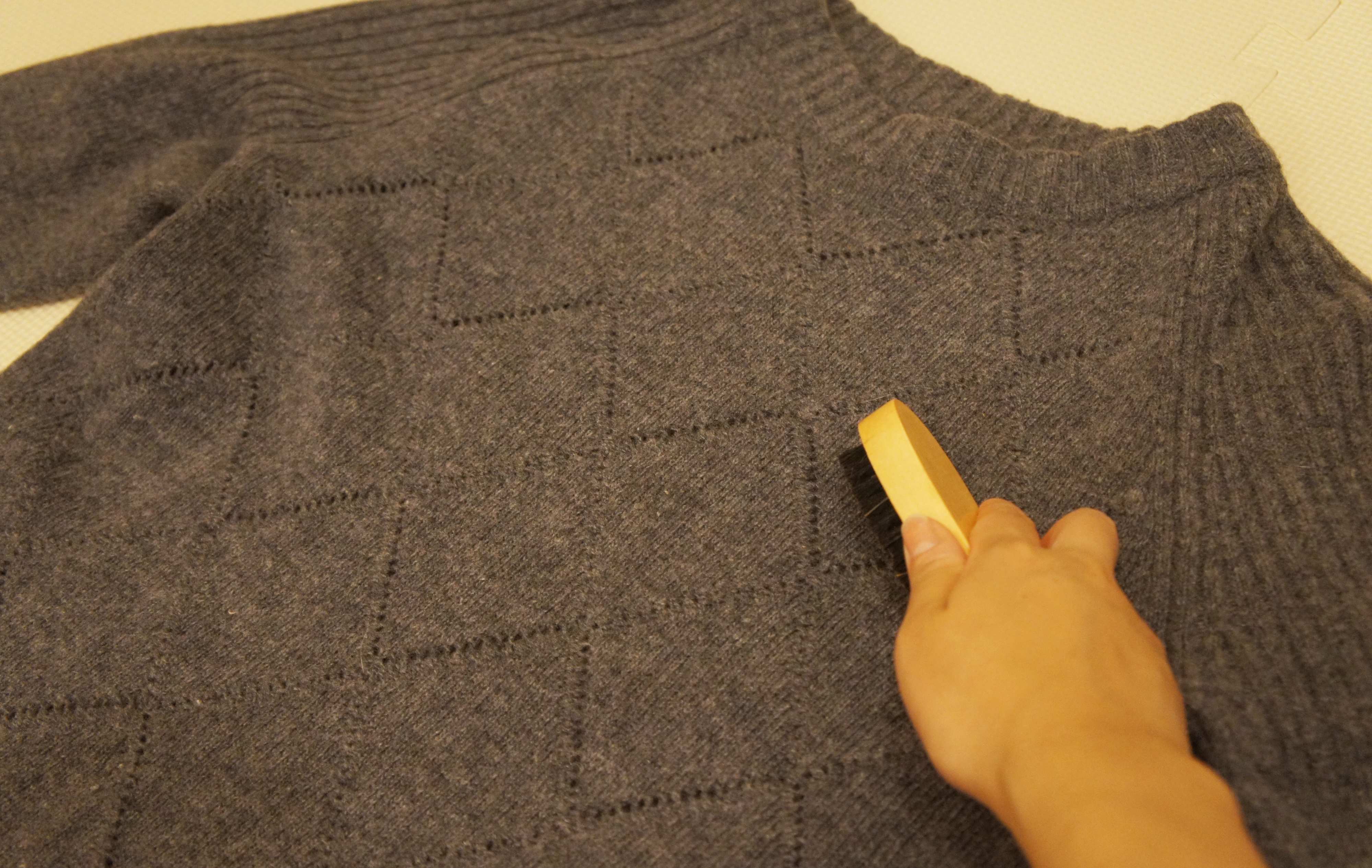 毛玉取りブラシをセーターにあて、上から下に軽くこすって毛玉を取ります。大きな毛玉は1個ずつ毛玉をつまみ、ハサミを使ってセーターに穴を開けないように気をつけながら切り取って。