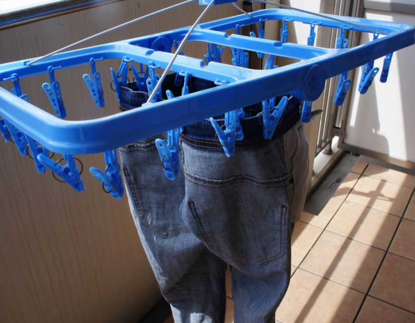 ジーンズを裏返して片方を物干し竿に通すと、風を通りやすく乾きもスピーディです。左右のすそをピンチでとめておきましょう。