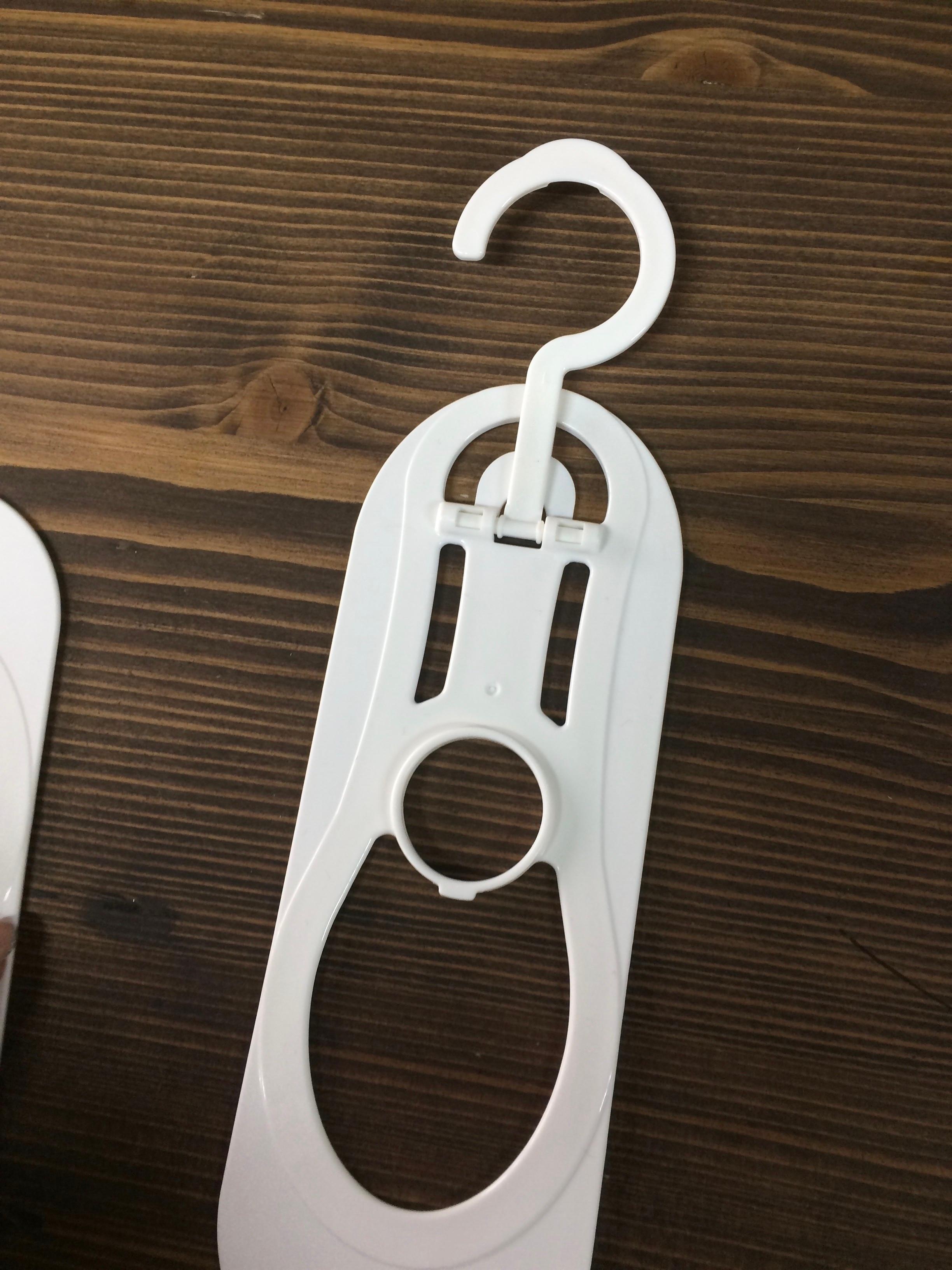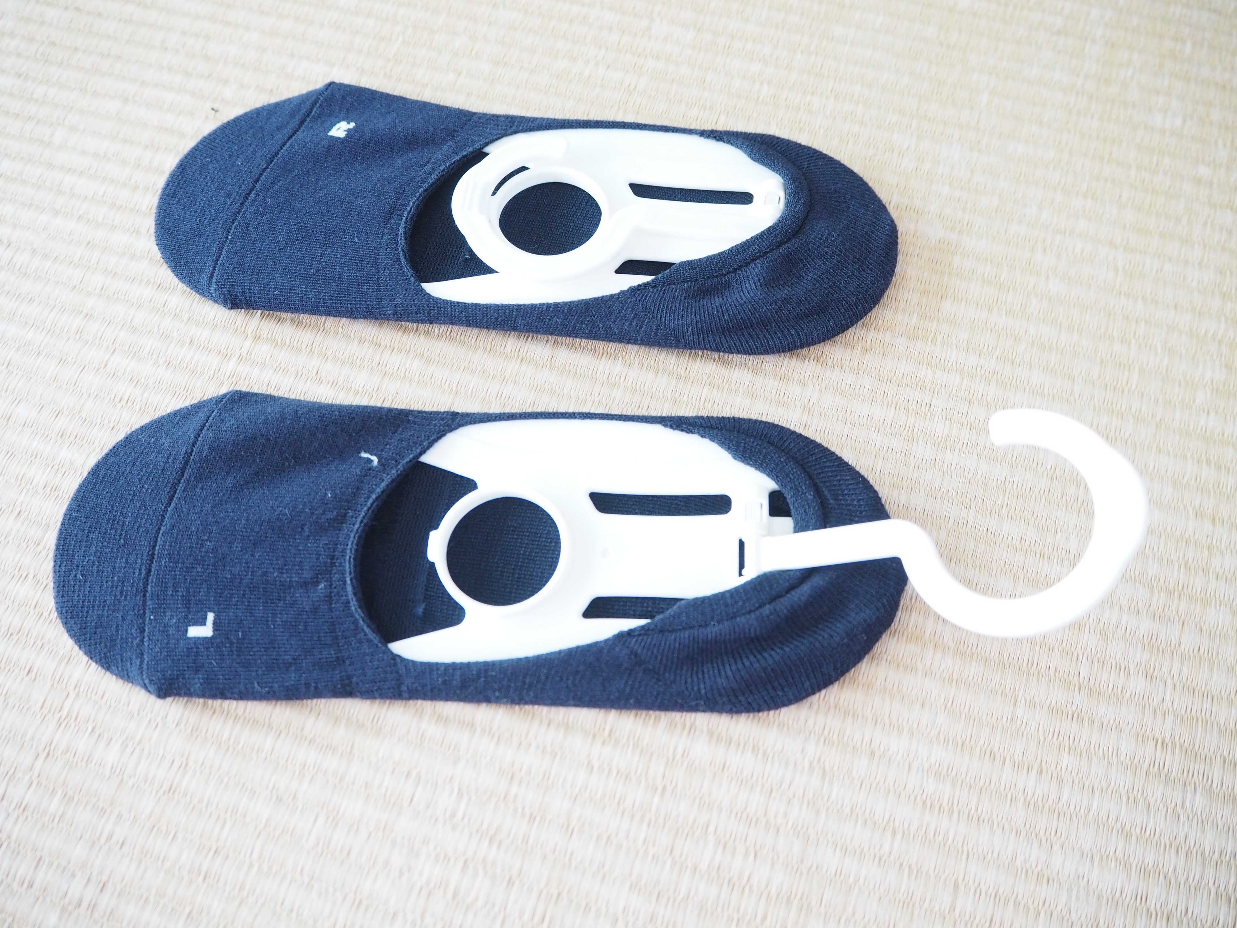 吊るす部分は収納式。しまう時はたたんで。干すときは出す。たったこれだけの動作で 干しにくかったパンプス用ソックスがキレイに収納できます。
