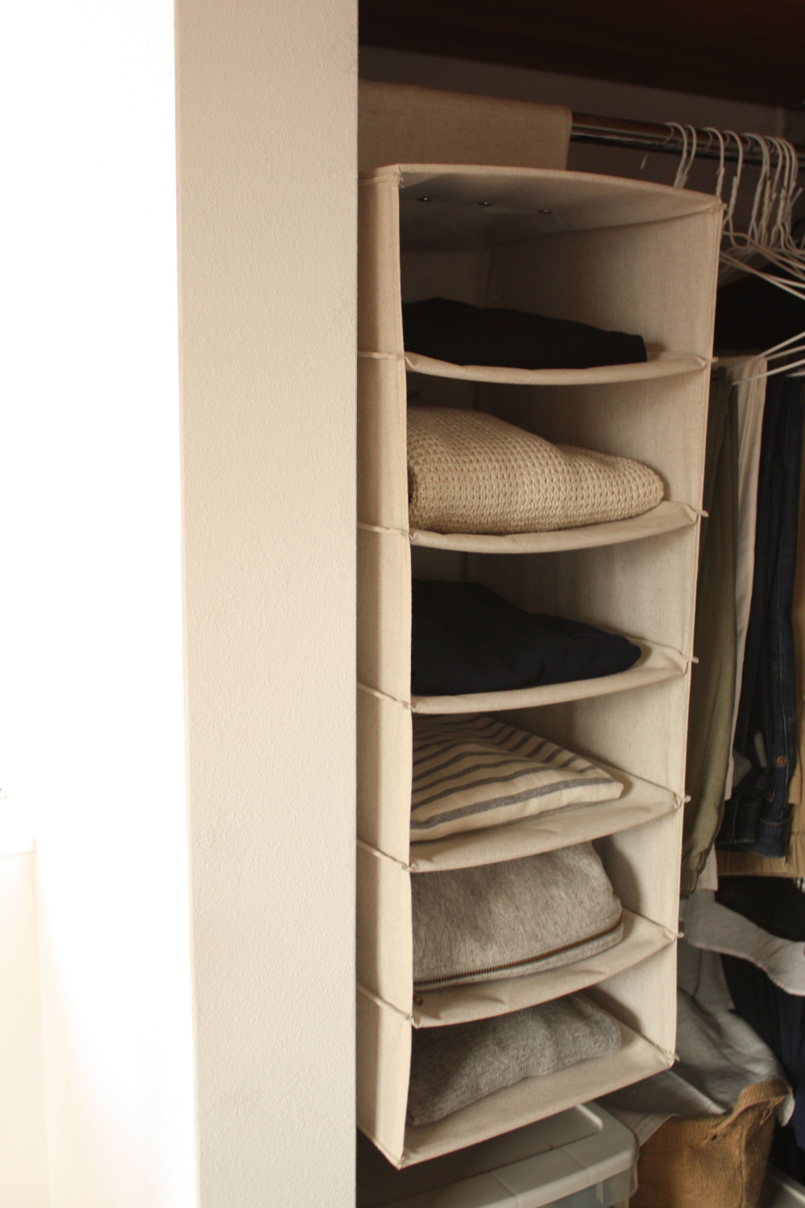 MIINAさんがクローゼットで使っているのは綿麻混の収納ホルダー。厚みのある生地の服や型くずれしやすい服は、たたんでここへ収納します。