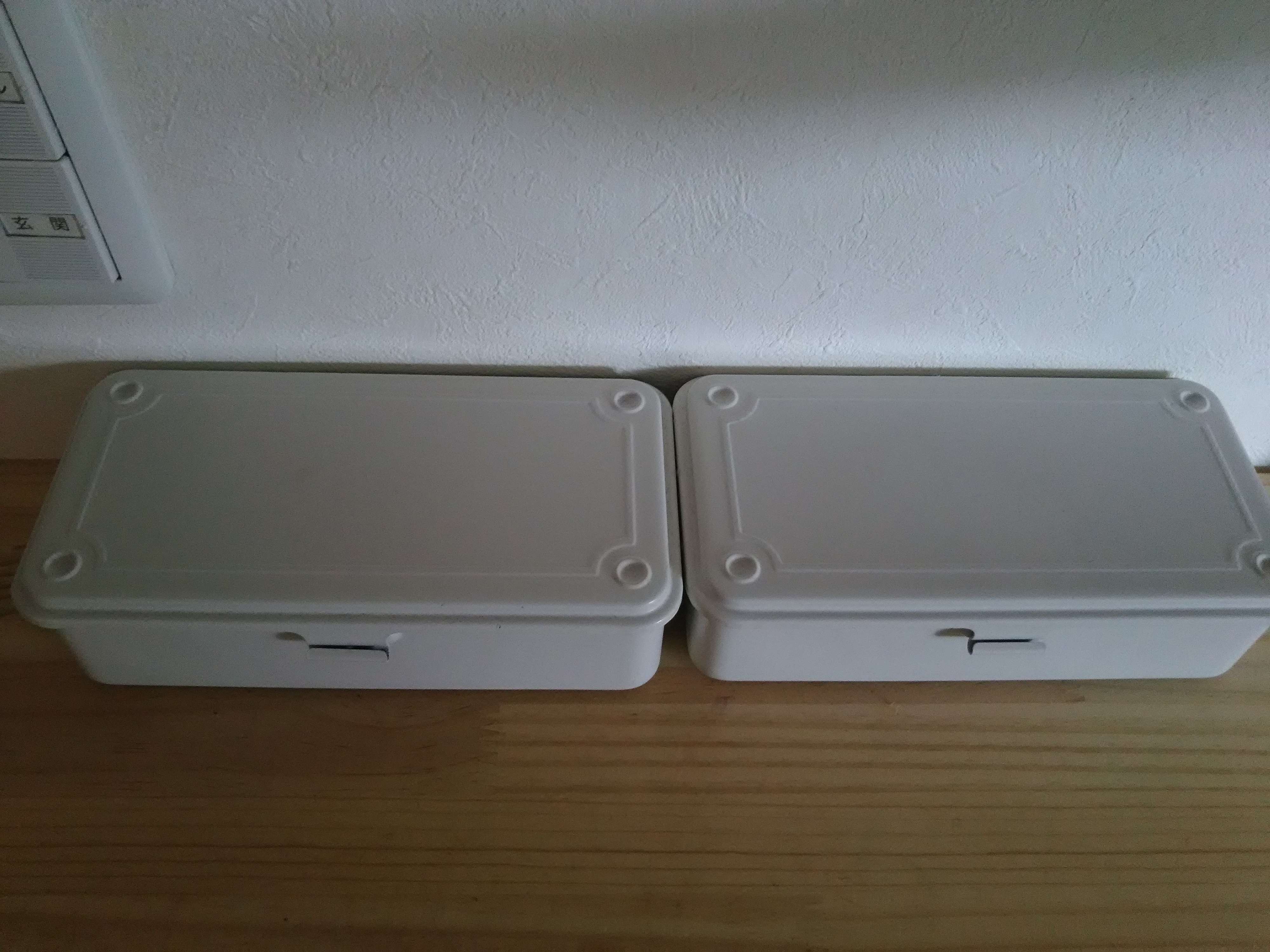 水江さんのお気に入りはスチール工具箱。ボールペンやハンコなどの小物をまとめて収納して玄関に置いているそうです。裁縫箱や思い出の品の収納にもよさそう!