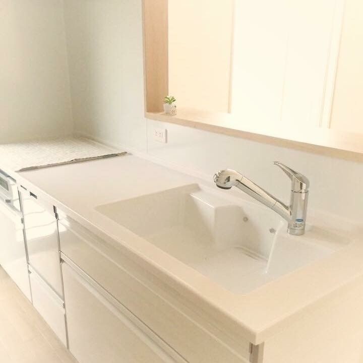 サンキュ!トップブロガーMIINAさんのキッチン。基本的に、シンク周りの洗剤とスポンジ以外、何も置かないようにしているそう。作業スペースも広々としていて、いつでもすぐに料理にとりかかれます。