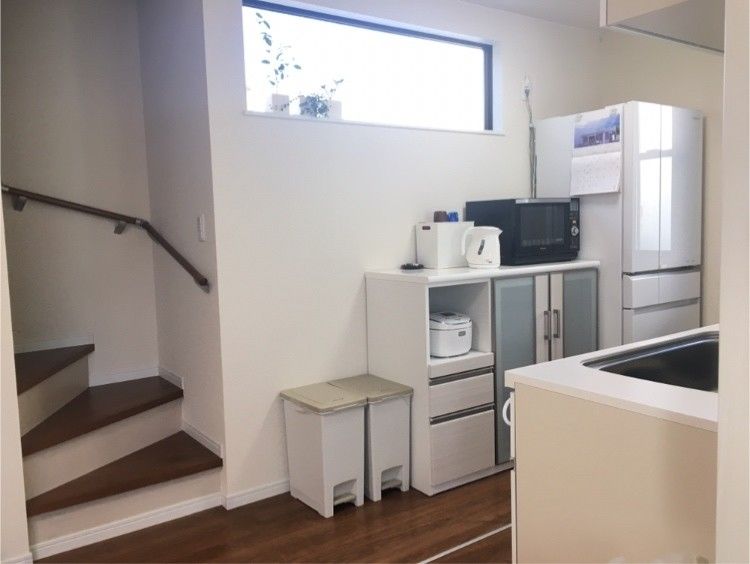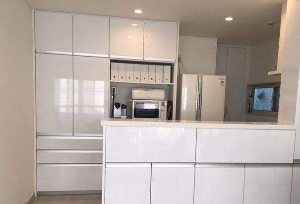 カウンターキッチンの背面に、冷蔵庫や電子レンジ、ごみ箱などを置いているcomayoさんのキッチン。このエリアの物は、意識的に色のトーンを揃えているそう。レンジ横の白いボックスの中には、子どもたちのカラフルな水筒が入っています。