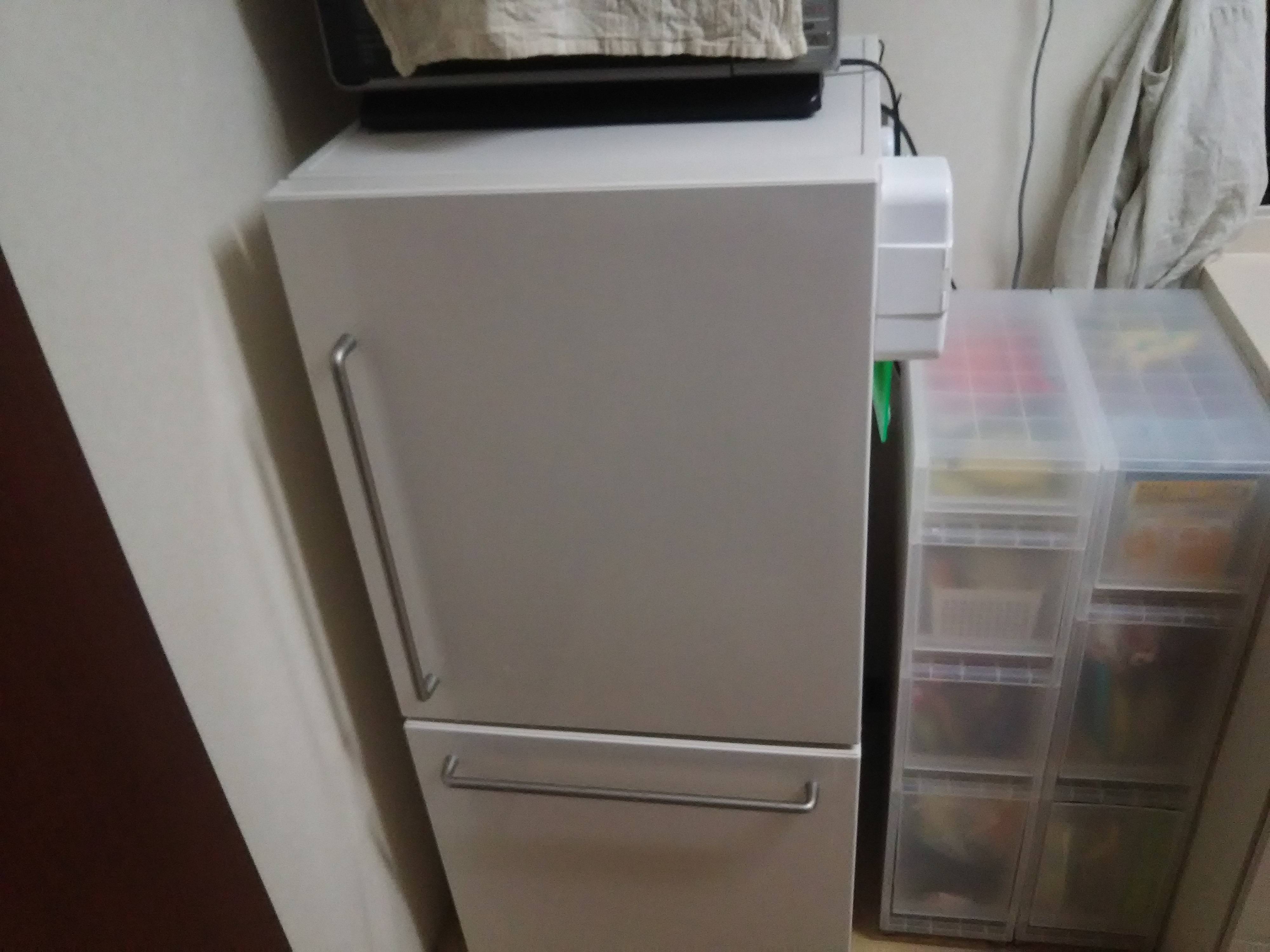 水江さんのお宅の冷蔵庫周りはこのような感じ。冷蔵庫の扉には何も貼らず、白の面積が多い分とてもスッキリとして見えます。こまごまとしたキッチングッズは、冷蔵庫の隣にある透明ケースに収納。冷蔵庫上にあるオーブンレンジには布をかけ、存在感を消しています。