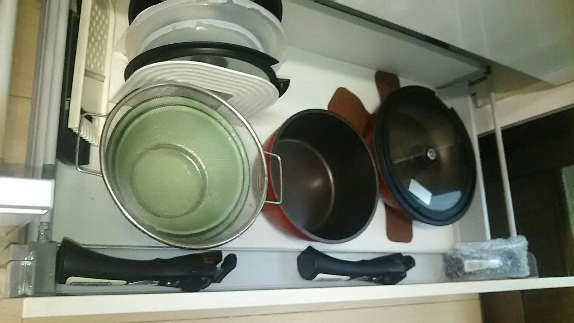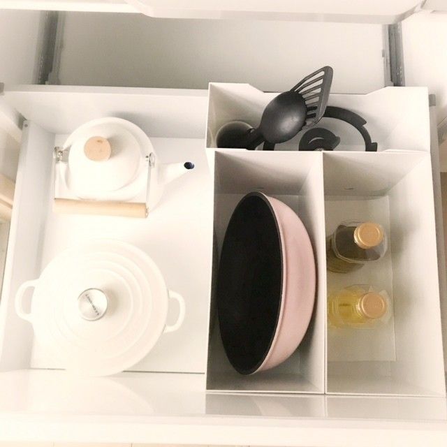 水江さんはコンロ下の引き出しに鍋などを収納。忙しいときでも取り出しやすいよう、あらかじめ収納スペースには余裕を持たせています。キッチンの外観だけではなく、引き出しを開けたときにもスッキリと中身を見渡せるよう、心がけているそう。