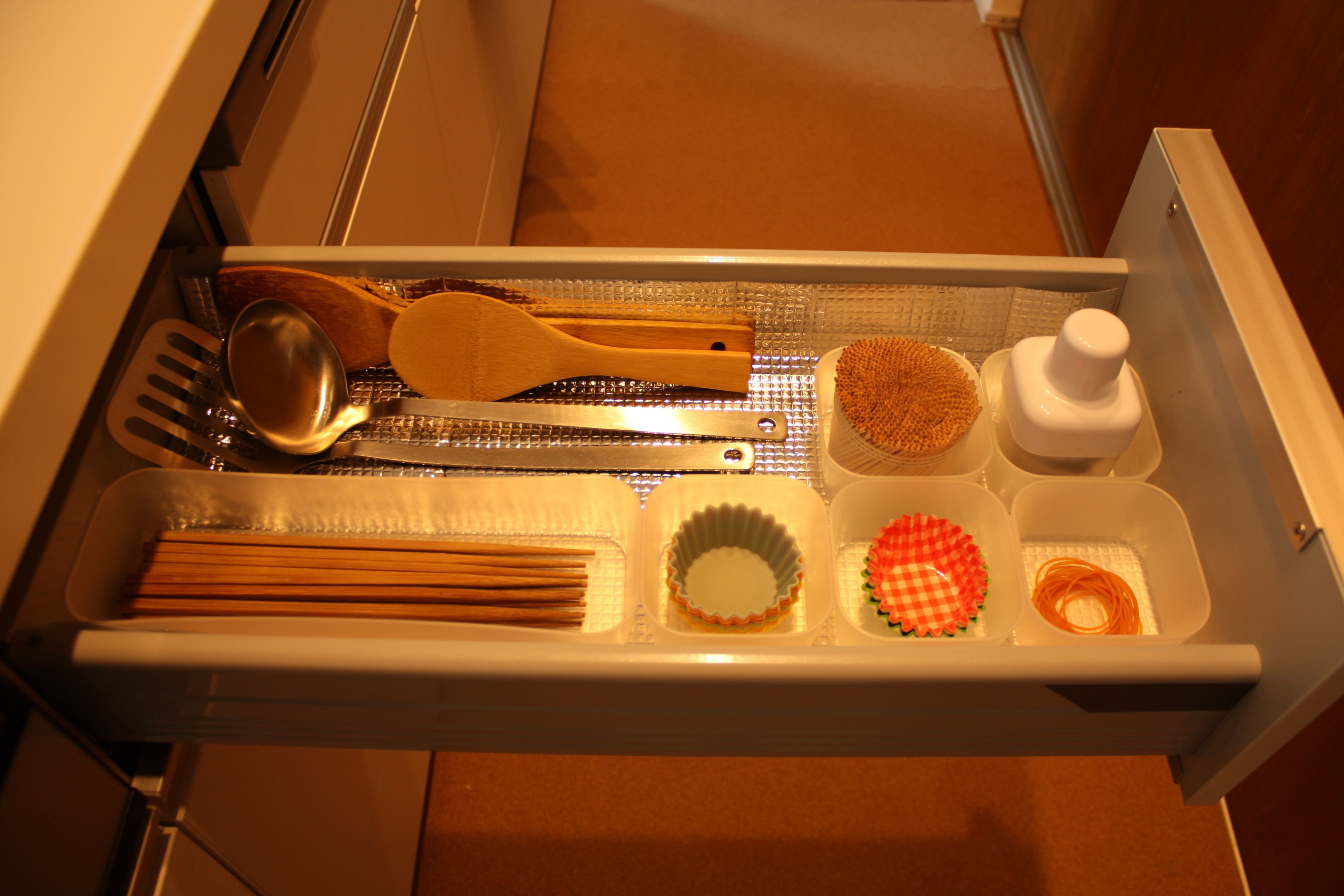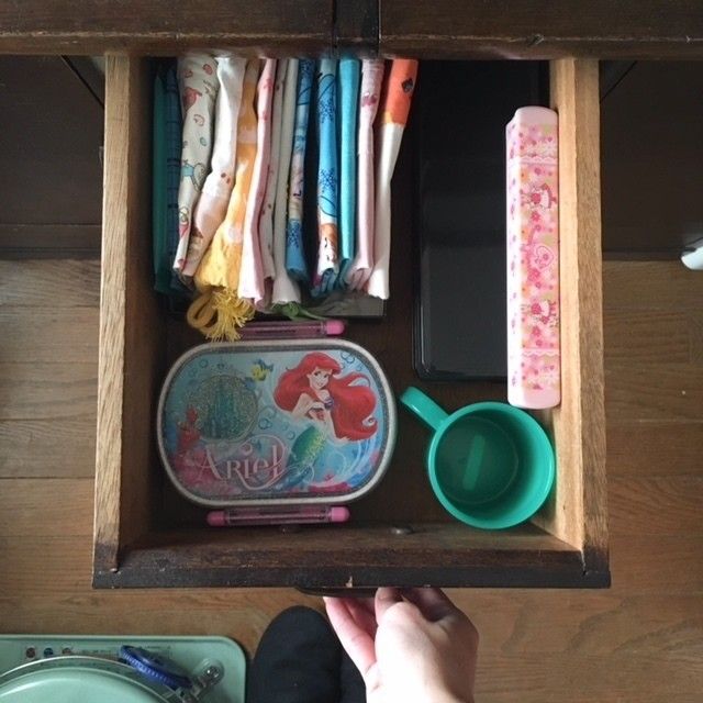 junkaさんの場合、お弁当箱の収納専用の引き出しがあります。ここにお弁当包みや袋、お箸などもまとめて収納。お弁当を詰める作業はキッチンで行うので、紙カップなどは調理道具を収納している引き出しにしまっているそう。