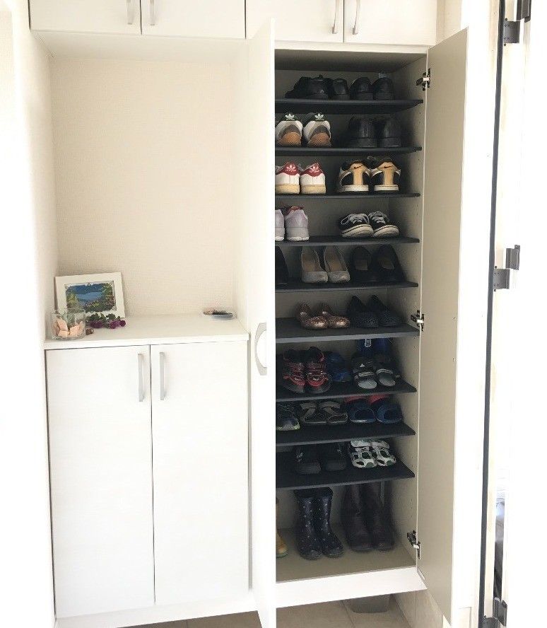 続いてはcomayoさんのお宅の靴箱です。高い場所には夫の靴、低い場所には子どもの靴をしまうなど、家族がスムーズに出し入れできるよう工夫。収納面積に適した靴の数で、無理なく収まっていますよね!