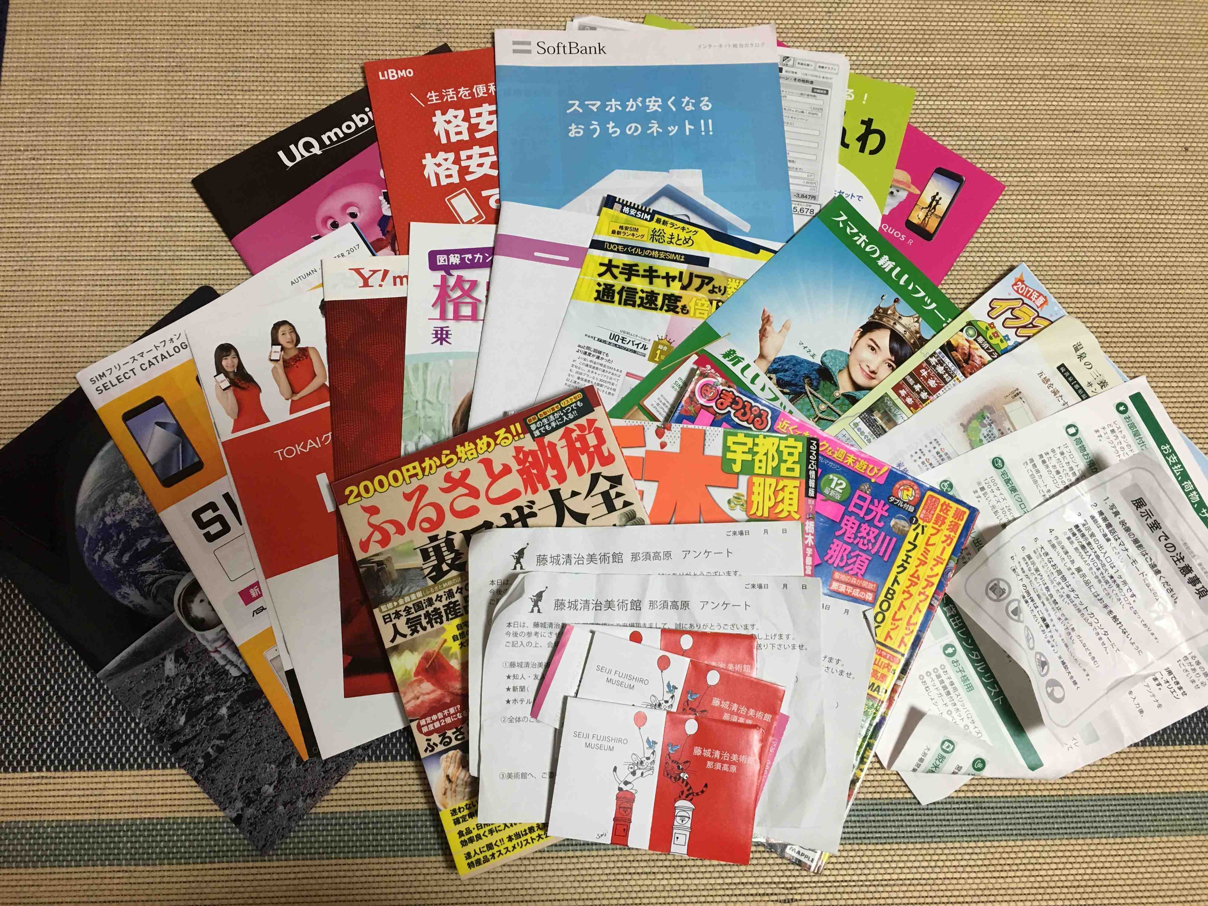 スマホの修理のため、新しいプランの案内書のほか、前から気になっていた格安スマホをのパンフも全部お持ち帰り。買い物ついでに懸賞ハガキももちろん持ち帰る。お子さんのお便りも2枚あり、1週間紙ものだけでもこんなに増えたことにショックだったとか。