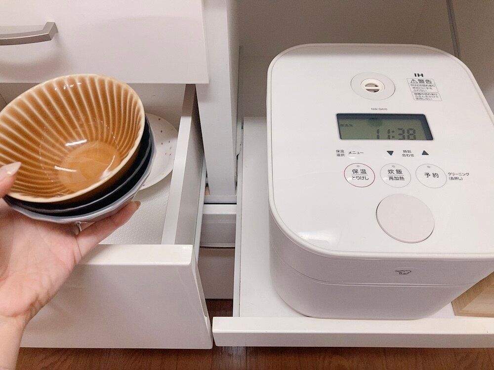 例えばお茶碗は炊飯器の横の引き出しに収納したり、一緒に使うものは重ねて置いておくなど、少しでも動きをラクにできる収納をつくることが大事です。