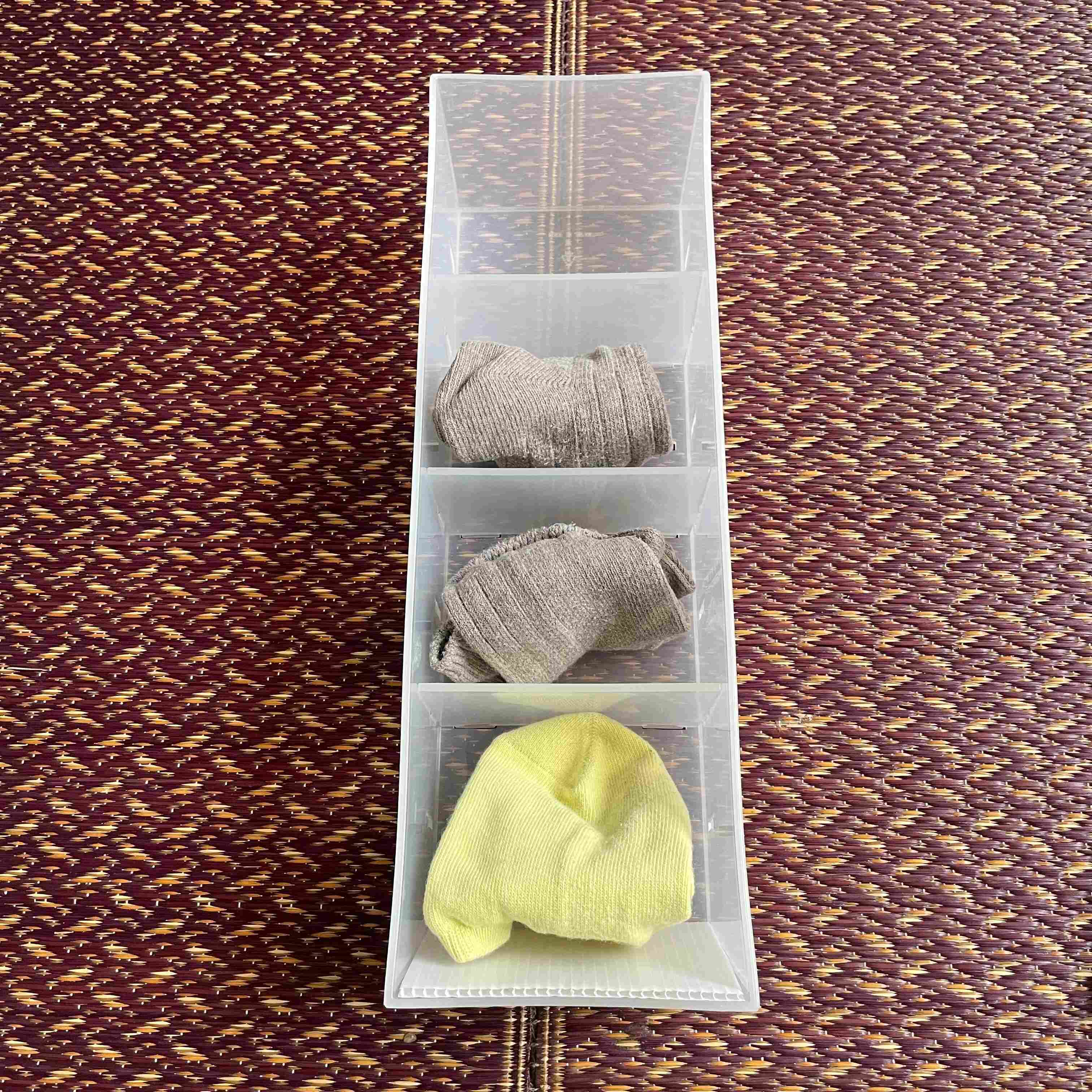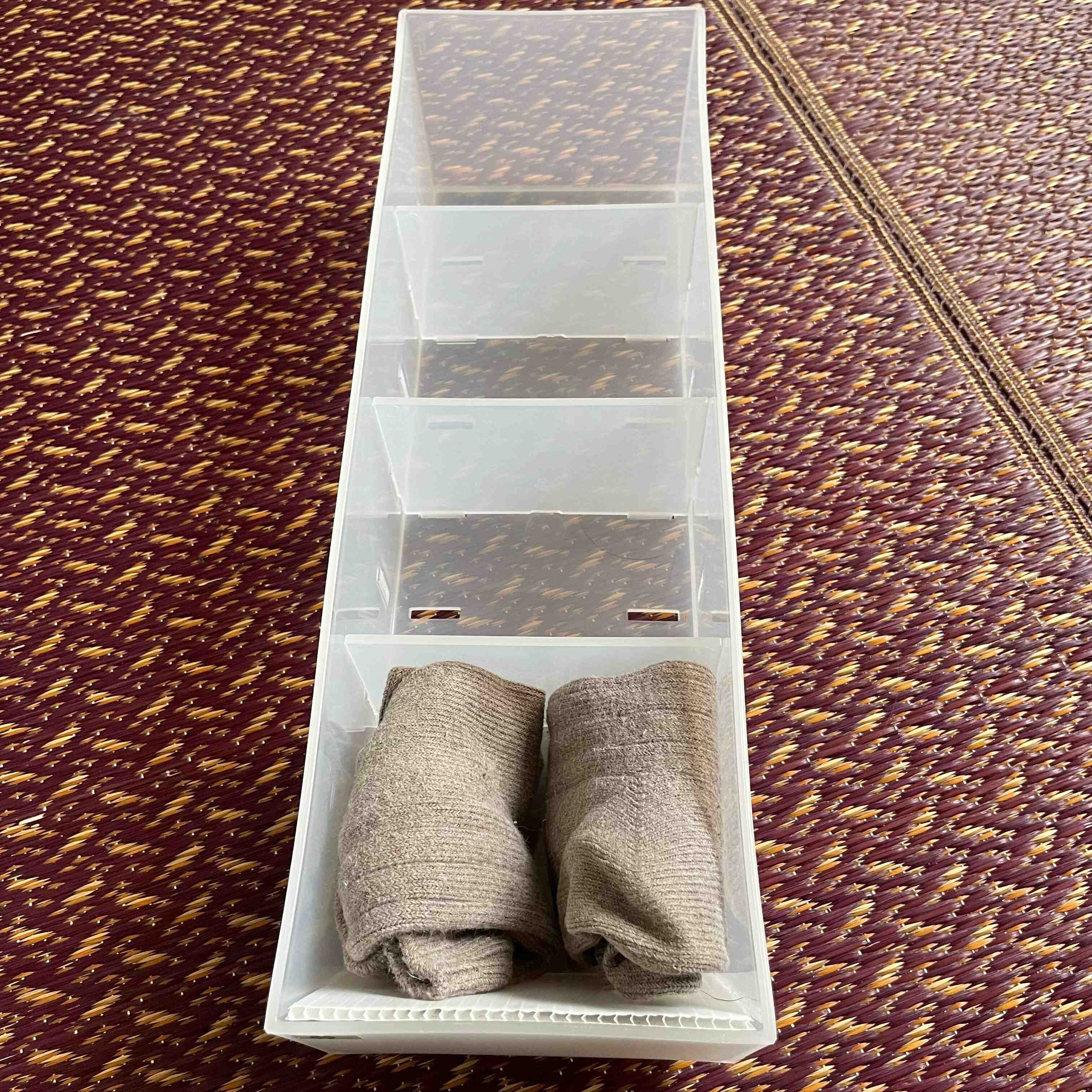 8足入るので1週間は毎日違う靴下で過ごせますし、仕切り付きなので、たたまずにポイポイ入れても紛失することはありません。少ない数で履き回せばその分寿命がくるのも早いので、管理もラクですよ。