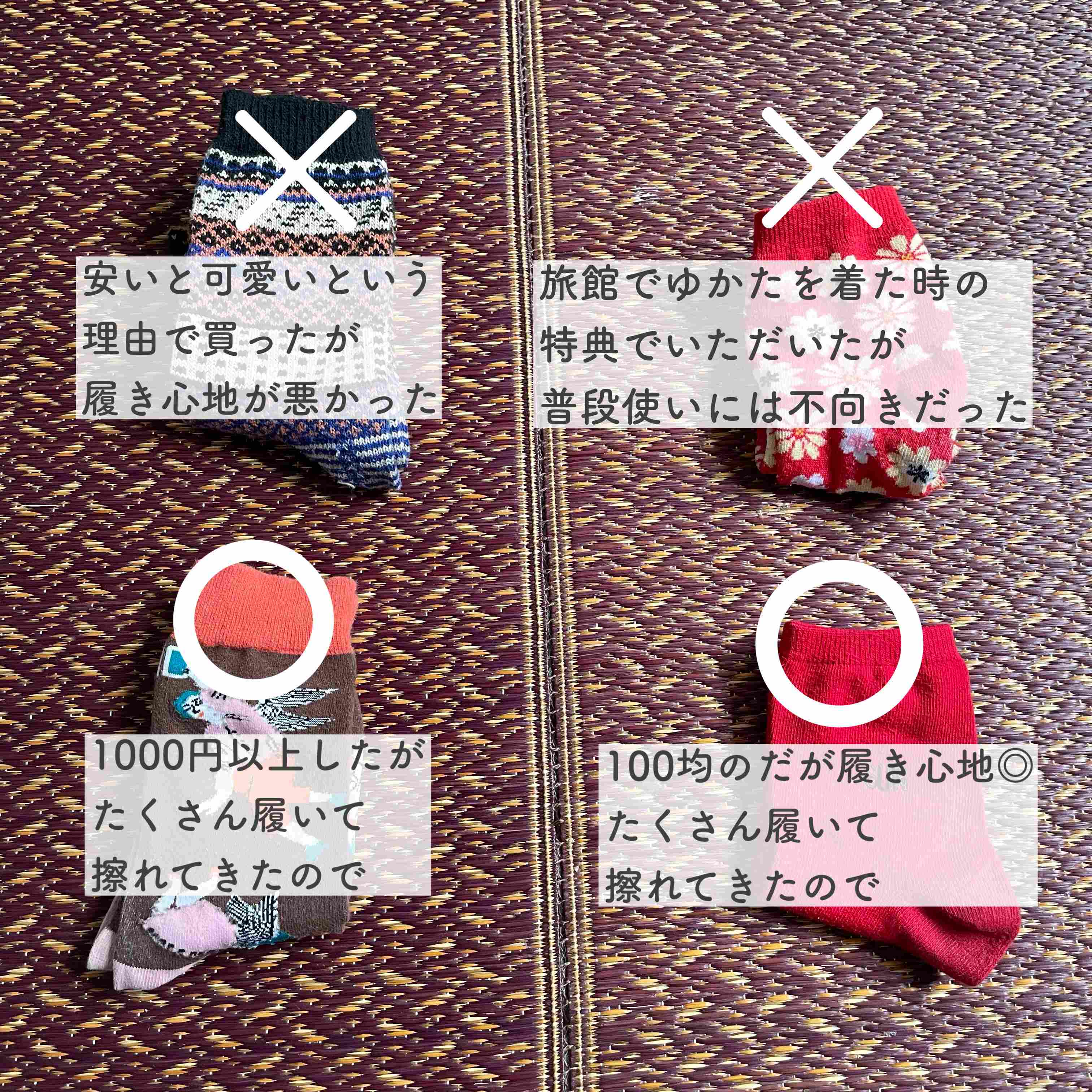 結果、1足1,000円以上の靴下が1番よく履き満足度が高かったです。逆にデザインがかわいかったり無料でも履き心地が良くなければ避けてしまう、ということが分かりました。