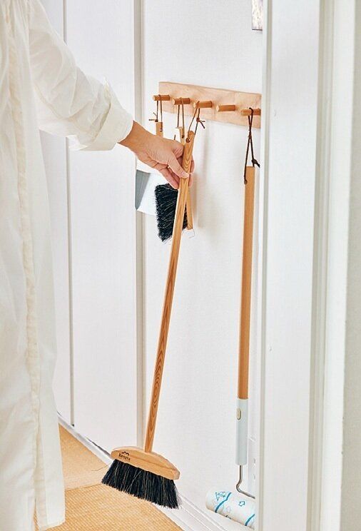 和室入口の目につきにくい場所にほうきやちりとりをスタンバイ。「掃除は気づいたときにする派。掃除道具を片手ですぐ取れる収納なら、やる気が消えないうちにサッと手を動かせます」。
