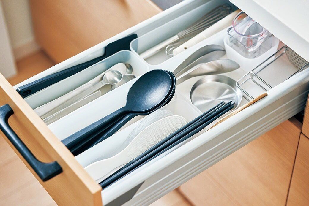 「シリコン製のツールは、油やほこりがつきやすいので引き出しの中に。ゆったり仕切ると出し入れしやすいです。調理スプーンは作業中に洗って使い回すのが手間なので3つ用意」。