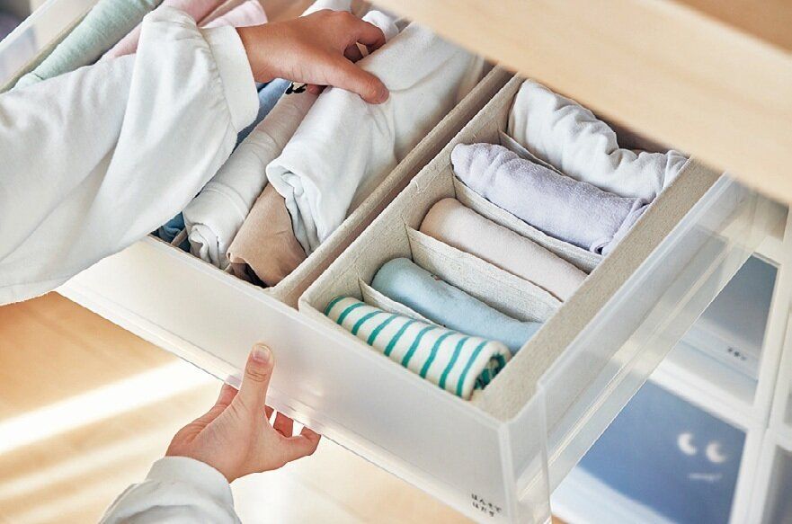 服を立ててしまう際に仕切りがあると、服の数が減っても崩れません。「整理し直す手間がなく、子どもも取り出しやすくて快適。私は『霜山(しもやま)』の下着収納を愛用しています」。