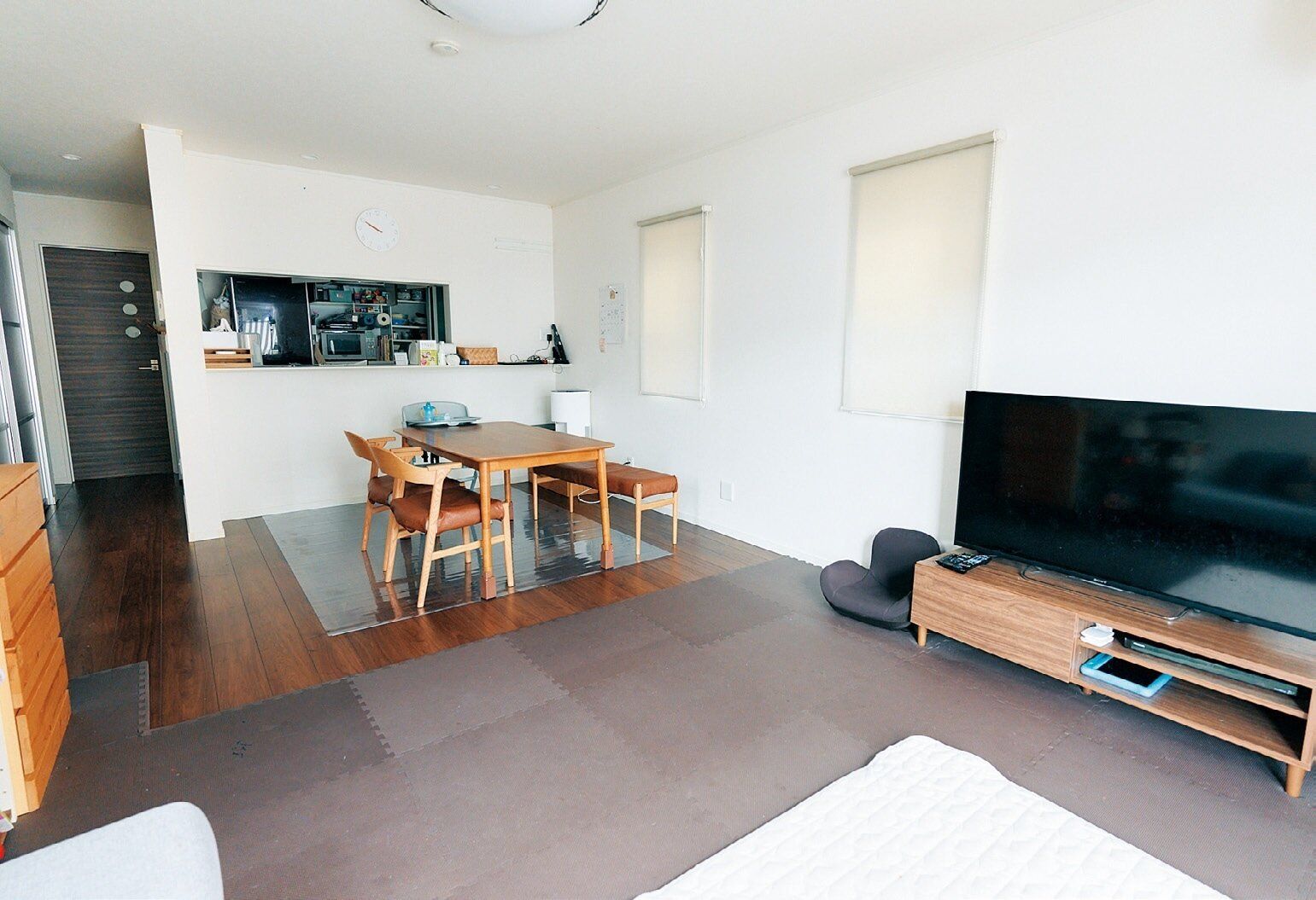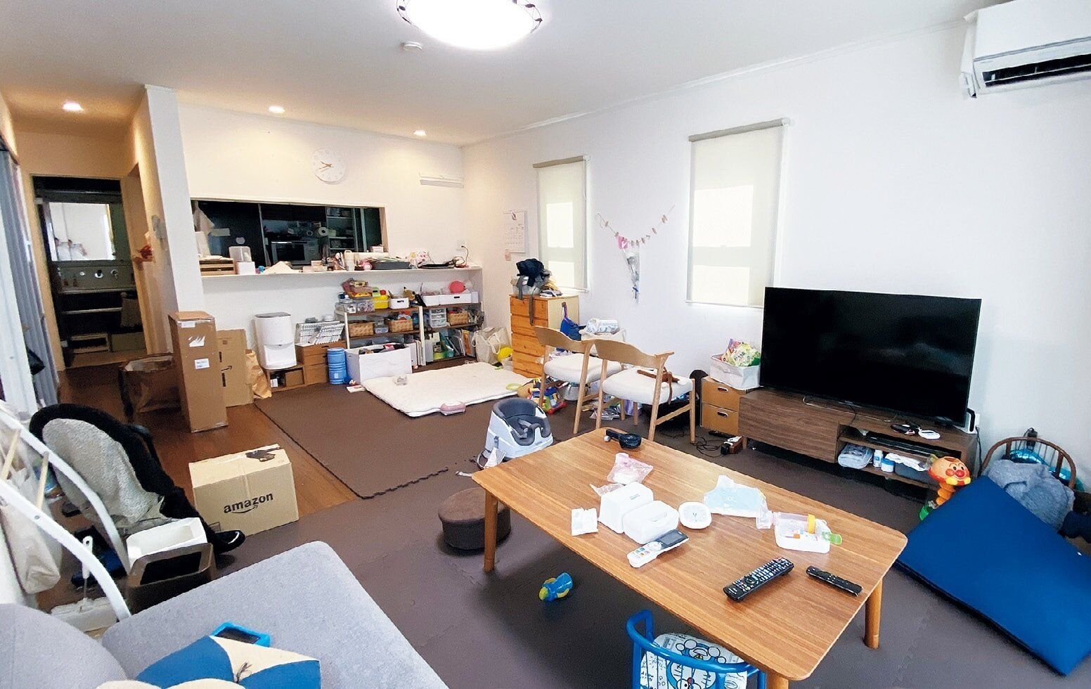 小学生から赤ちゃんまで3人兄弟の小船家。学用品からおもちゃまでが全てリビングに。特にカウンター下は丸見えのおもちゃ類で魔窟状態!
