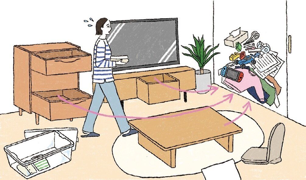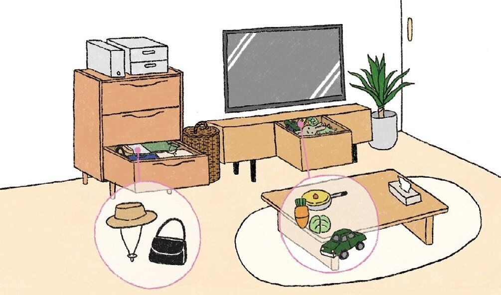この時点で「捨ててもいいな」と思えた物は捨てる。使ってないけど捨てたくない物は、押入れの上や引き出しの奥など、普段使わない場所に埋めて。ぎゅうぎゅう詰めでもOK。