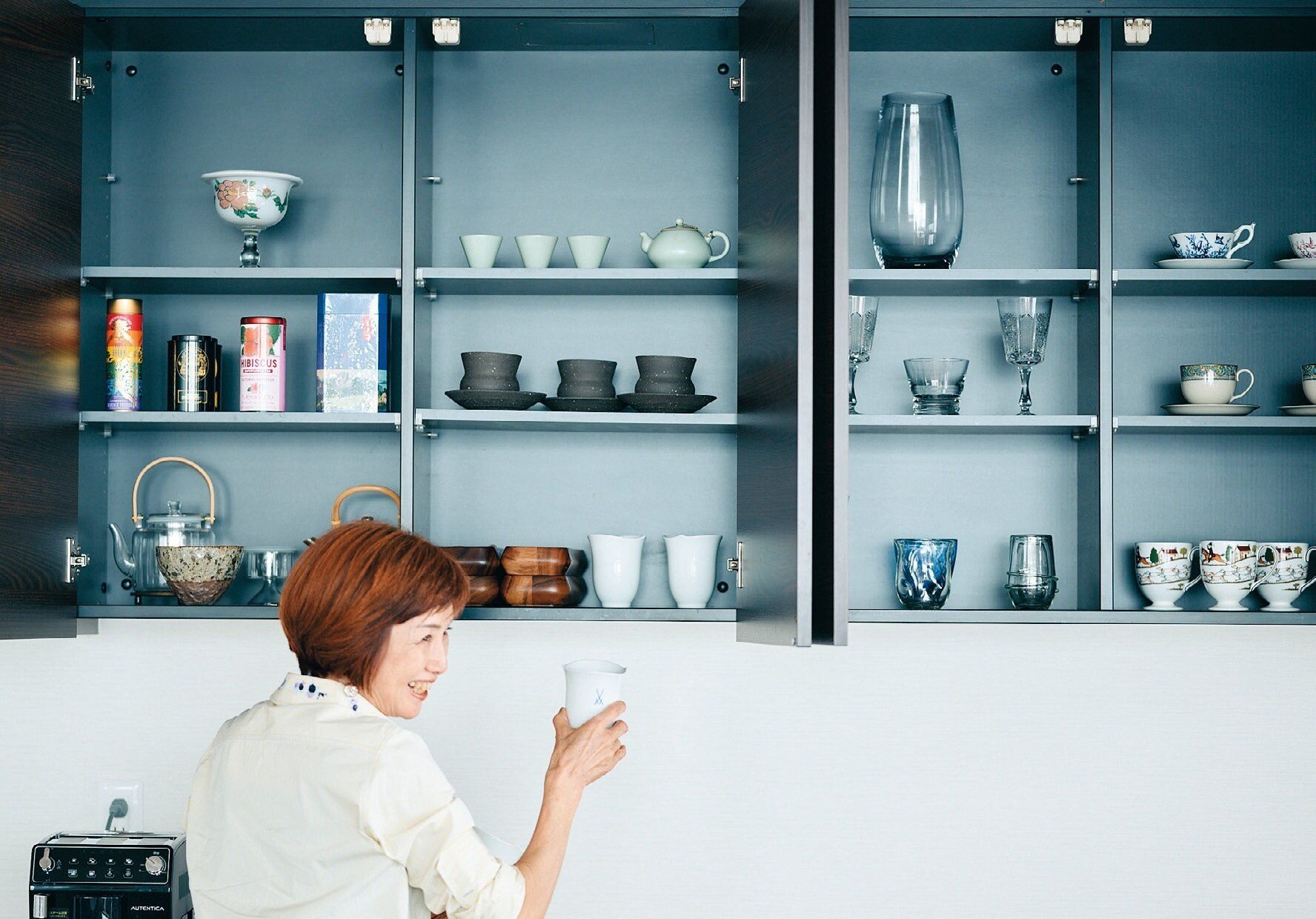 高い収納場所にはいらないモノを入れて放置してしまうのが人のさが。だからキッチン収納の一番上の棚板は外しました。お気に入りのグラスやカップを飾るように納めています。