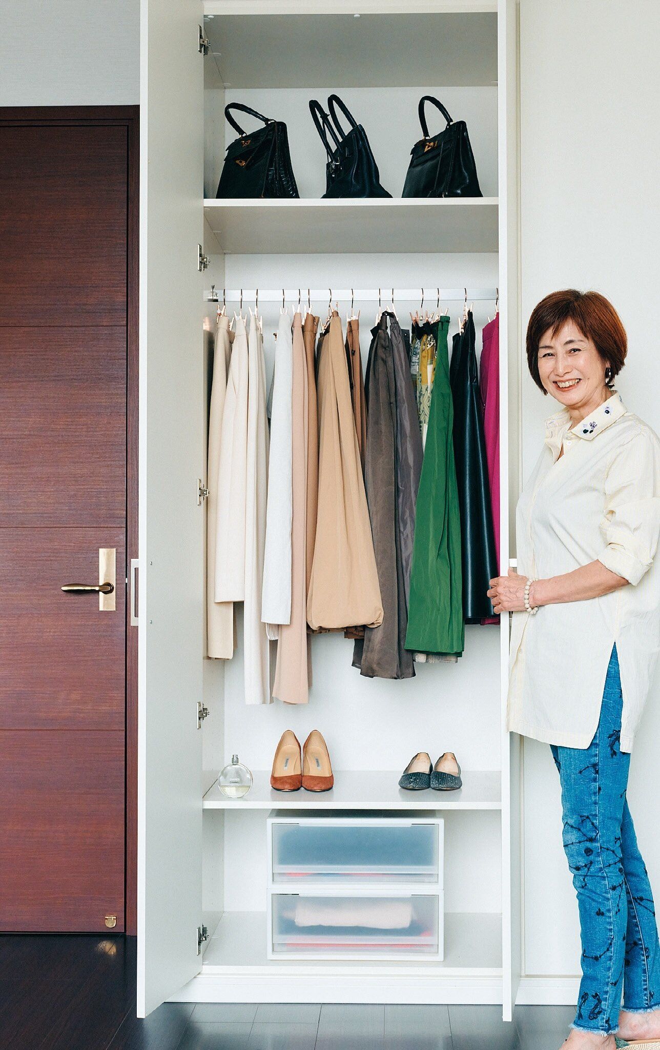 同居している友人と3人で洋服をシェア。モノの量は収納に対して5割。「余白」が今の自分に似合うバッグやシューズの美しさを引き立たせ、装うことが一層楽しくなります。