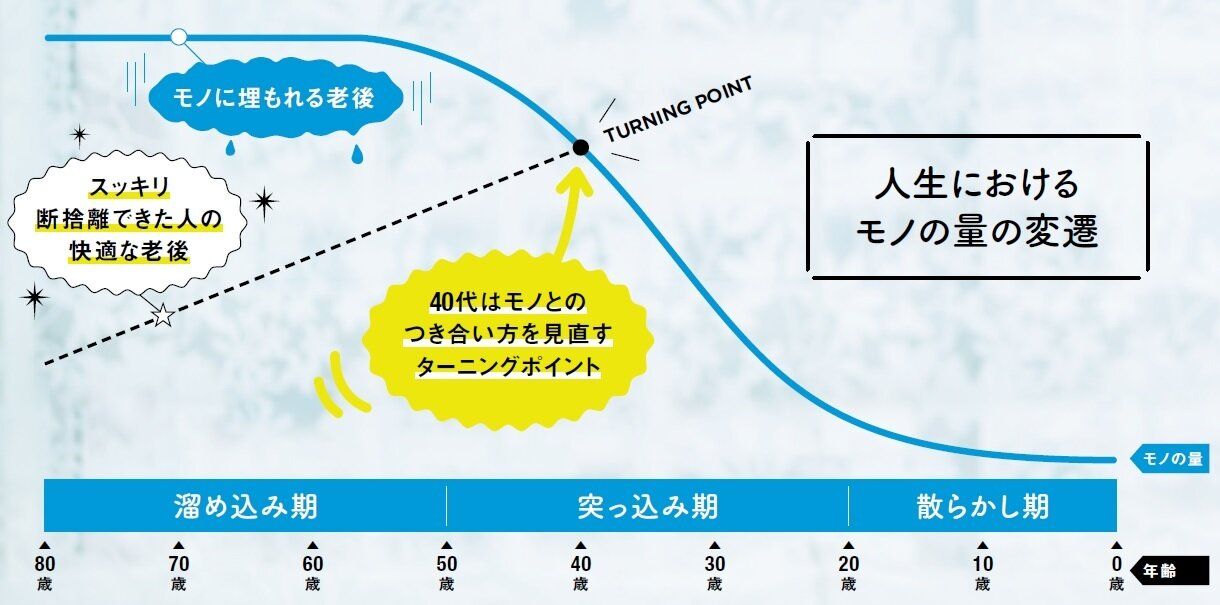 人は一生のうちにたくさんのモノを手に入れます。一般に20~30代は結婚や子育てなどで爆発的にモノが増え、40代で物量はほぼピークに。「家中モノだらけでストレス!」という人もいるでしょう。
