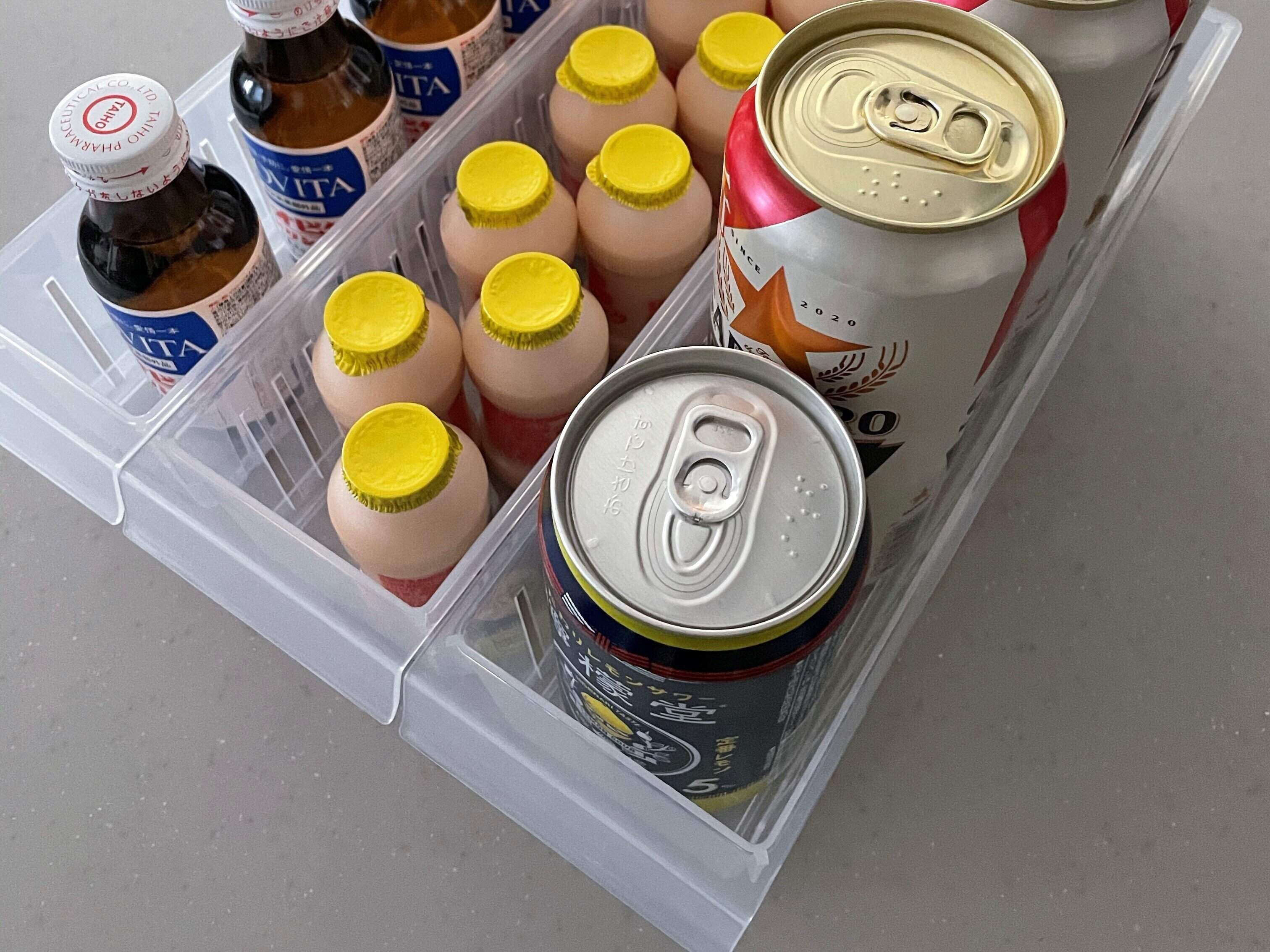 いつも消費する食材は定位置をつくると使いやすく、また購入時期も明確になります。我が家でいうと、ヤクルト、お酒、栄養ドリンク、納豆、このあたりは必ず冷蔵庫に在庫がある為、それぞれ定位置を用意しています。