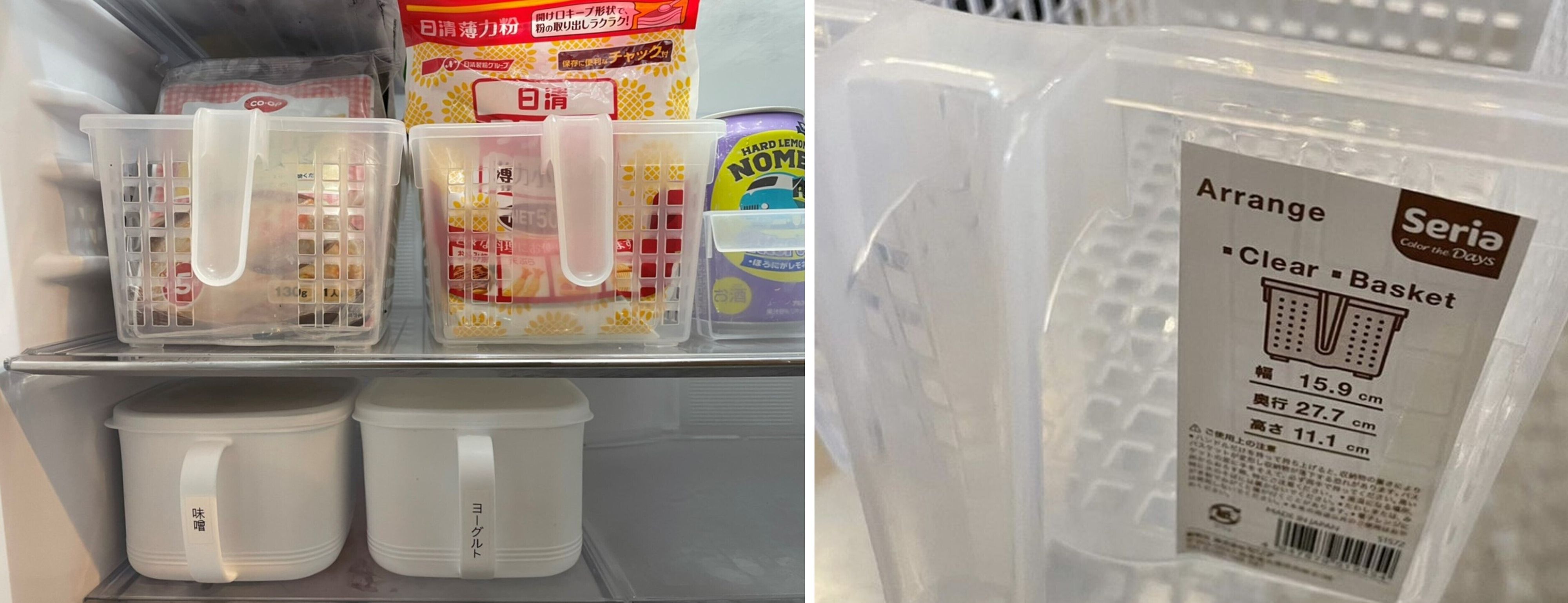 浅型なので冷蔵庫のタテ空間を有効に使いたいときに便利な、セリアの「アレンジメッシュ浅型(クリア色)」(幅17 ×奥行24×高さ7cm)。