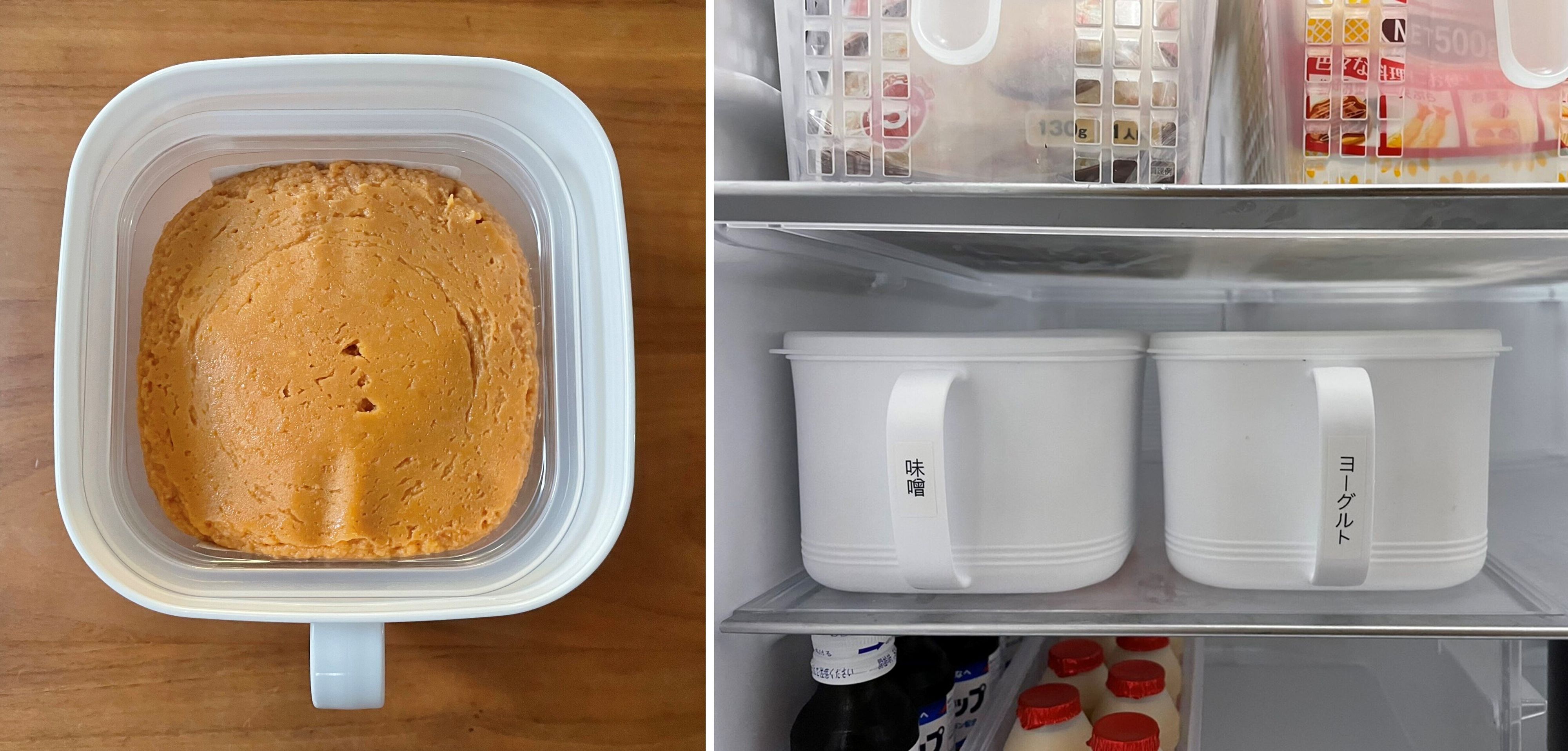 市販の味噌750gがすっぽり綺麗に入るセリアの「みそストッカー(大)」(幅16.3 ×奥行14×高さ9.7cm)。見た目もホワイト色でスッキリするとともに、取手があることで冷蔵庫内上部においても取り出しやすく便利です。ただし中身が見えないので、ラベリングも忘れずに行いましょう!