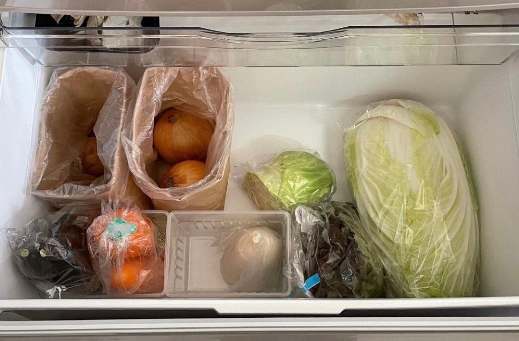 土汚れが気になるじゃがいもや玉ねぎなどは、セリアの「ガゼットバックLクラフト」(幅15 ×奥行<マチ>9×高さ28cm/8枚入り)に入れることで野菜室の掃除の頻度が減ります。高さがありますが折り曲げることができるので、冷蔵庫内の高さに合わせて調整できるところもポイントです。