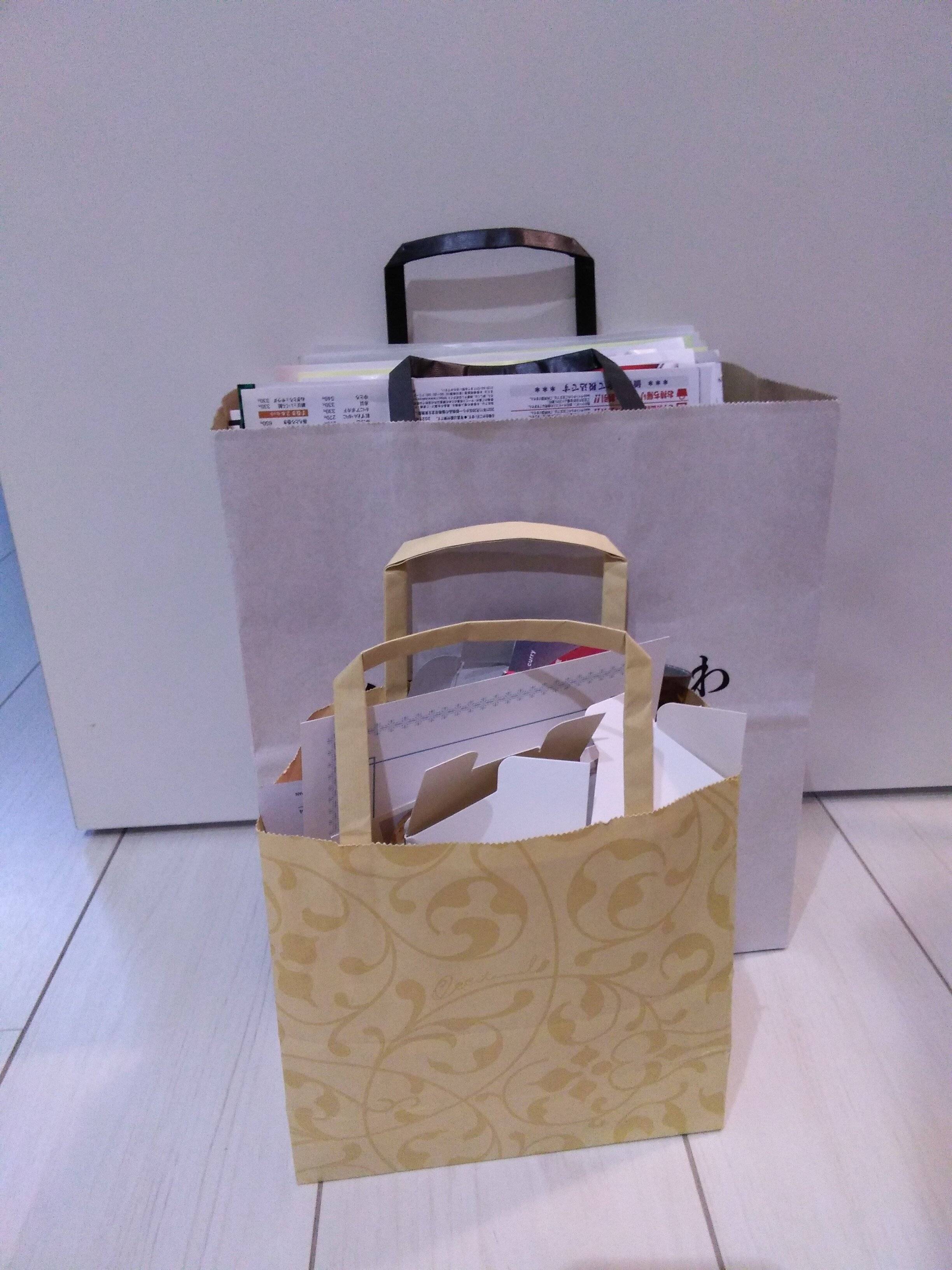 「大」の紙袋にはA4用紙のお知らせや雑誌、4つ折りの新聞紙などをまとめることができます。それ以外の紙袋には、商品が梱包されていた紙箱などをたたんで入れていき、溜まったら資源ごみとして出します。
