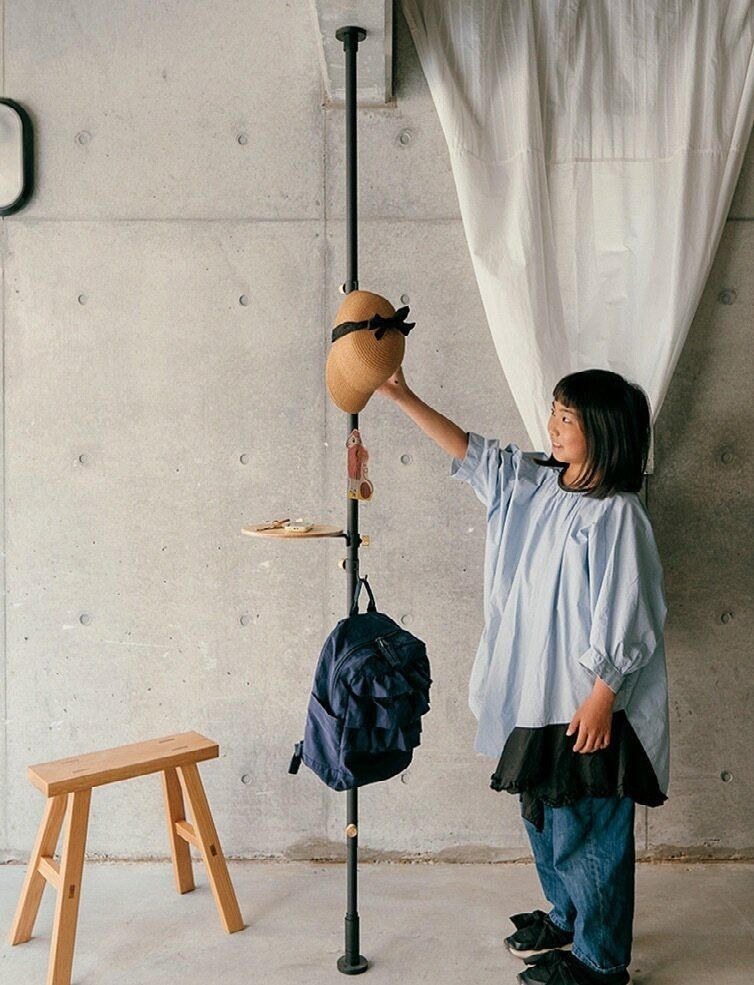 床と天井でつっぱって垂直に設置できるつっぱりポール。子どもの通園セットなどをまとめておくと、朝の身支度がぐっと楽になります。いろいろなパーツがあるので、設置場所や生活スタイルに合わせてチョイスして。