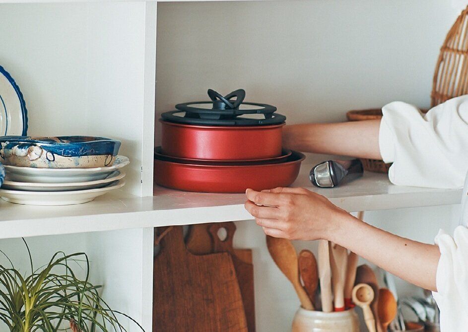 「重ねられる鍋やフライパンなら、 フライパン1個分のスペースにスッキリ収まる」