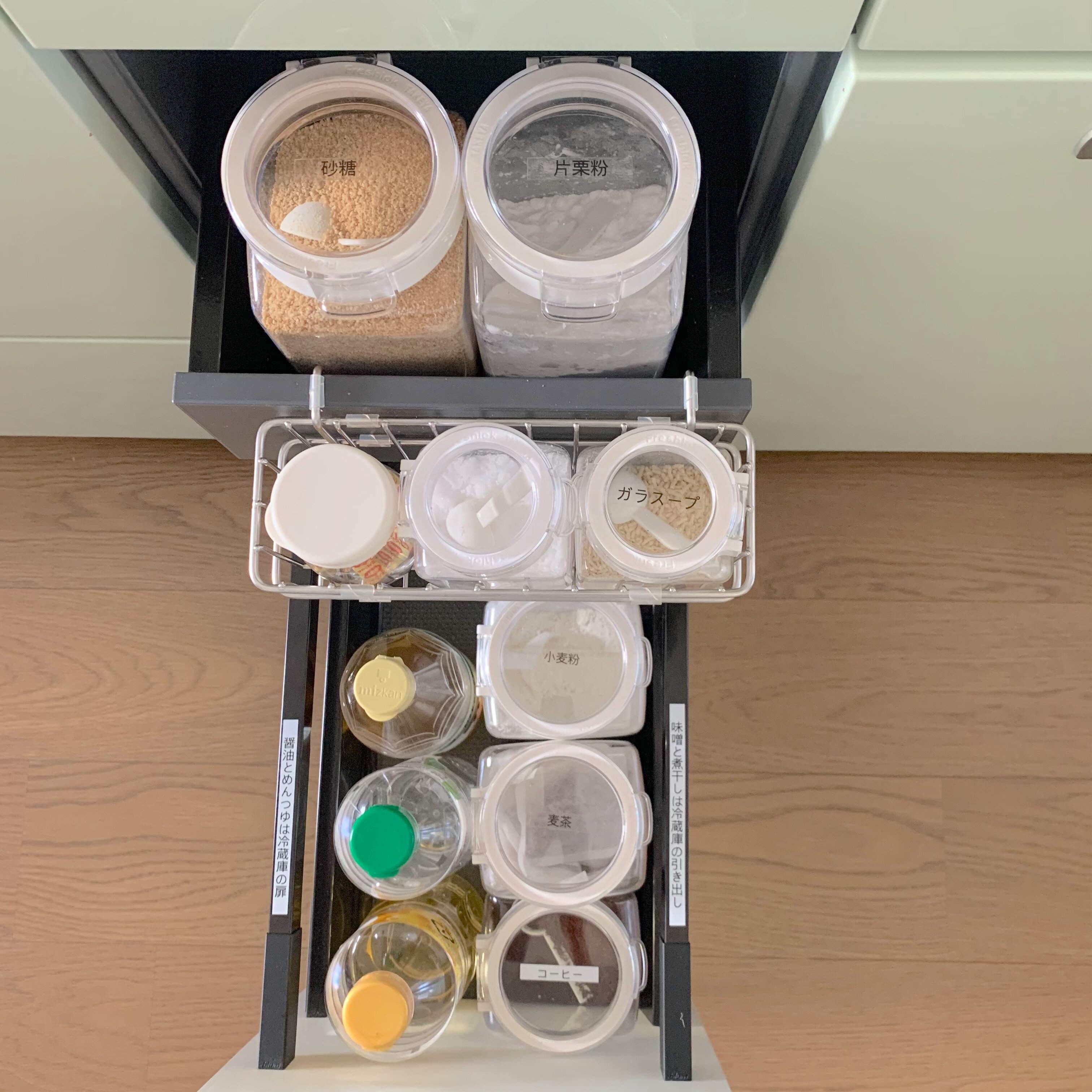 こうしておけば、必要なものを必要なときにパッと取り出せます。もちろん戻すのも簡単ですから、キッチンはいつも使いやすく料理がはかどります。