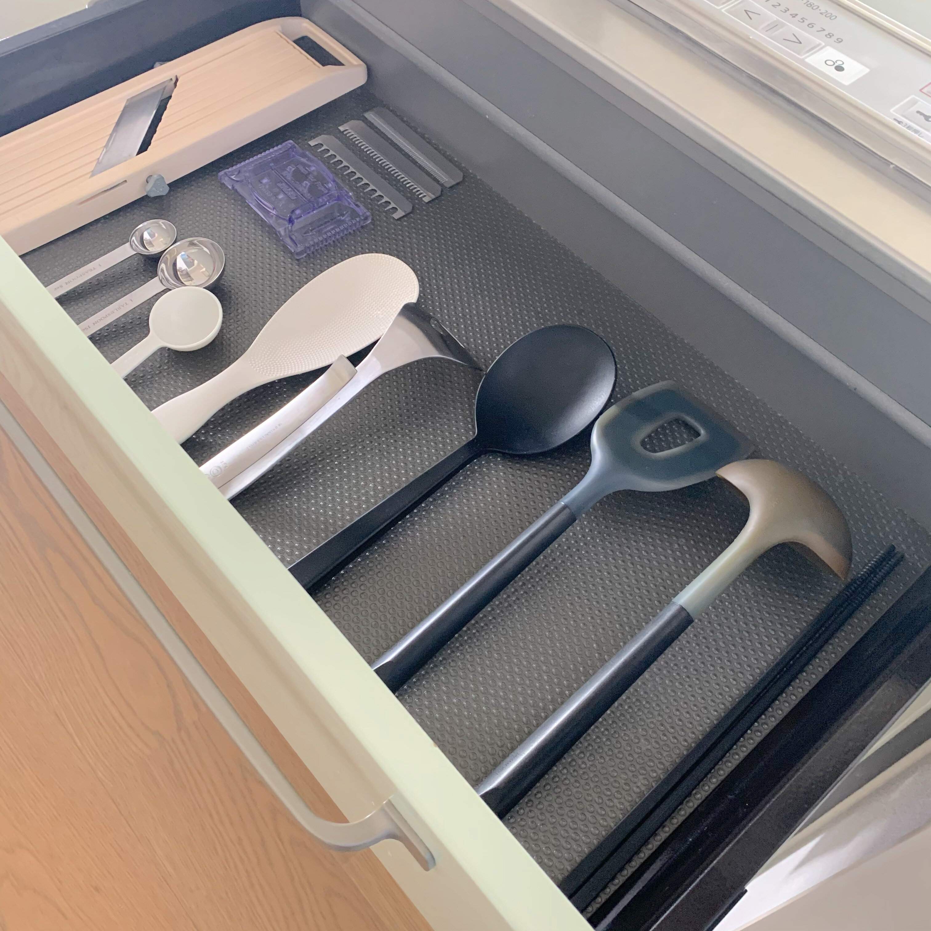調理器具も、食器も並べるだけの収納にすると便利でしょう。引き出しや棚に並べるだけなので、違う種類のものを重ねたり、たくさんのものをつめこんだりはしませんよ。
