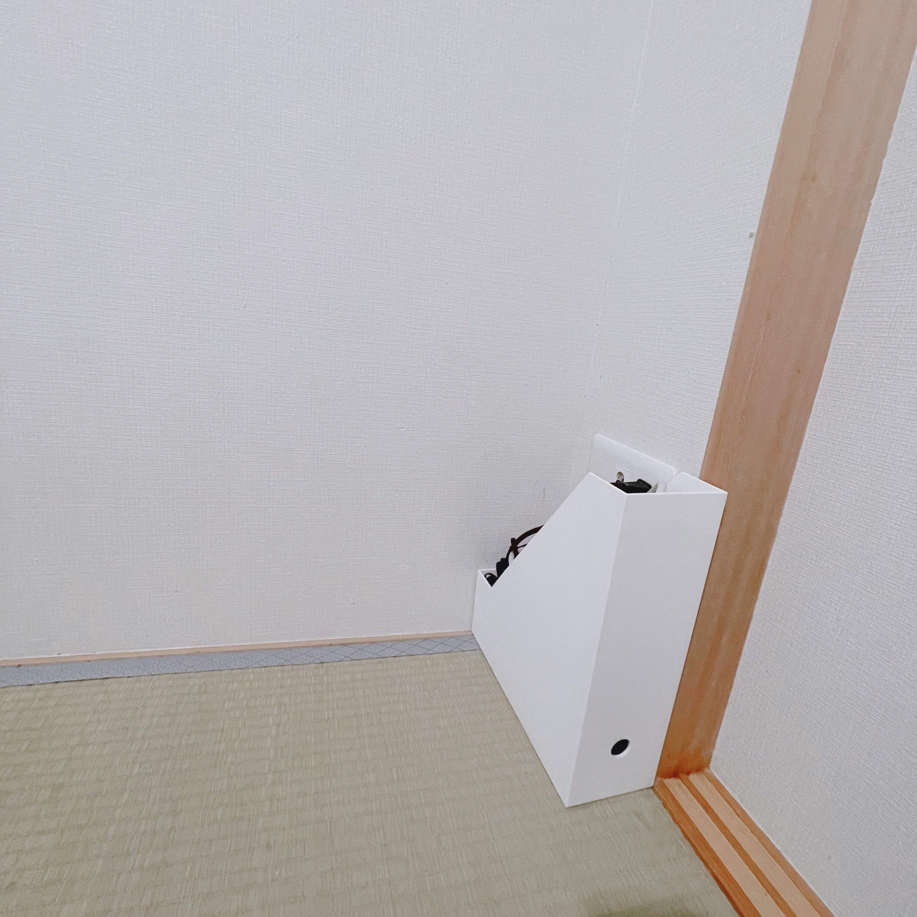 ボックスに入れるだけのカンタンルーター隠しです。ファイルボックスだと半オープン状態になっているため、熱もこもりにくく安心です。