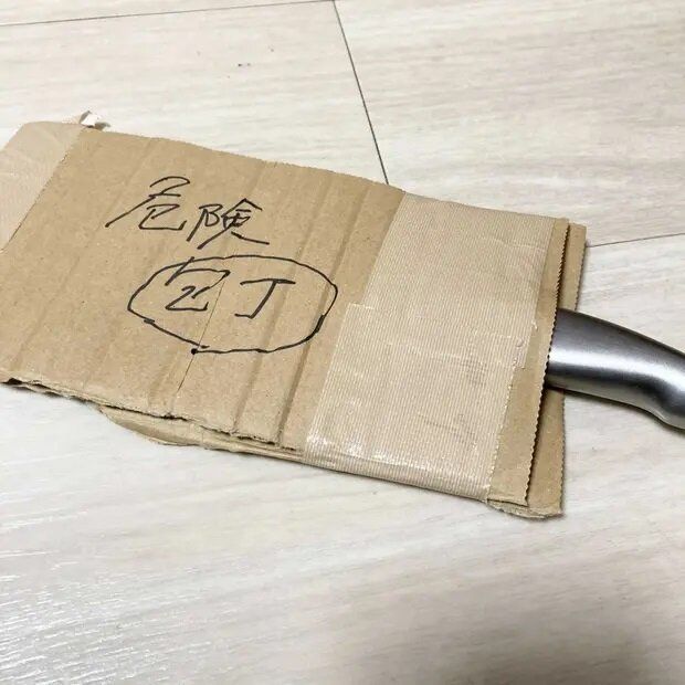 刃が出ないようにダンボールなどで刃を包み、写真のように「危険」であることと「どんな物」なのか、油性ペンなどで記載しておきましょう。