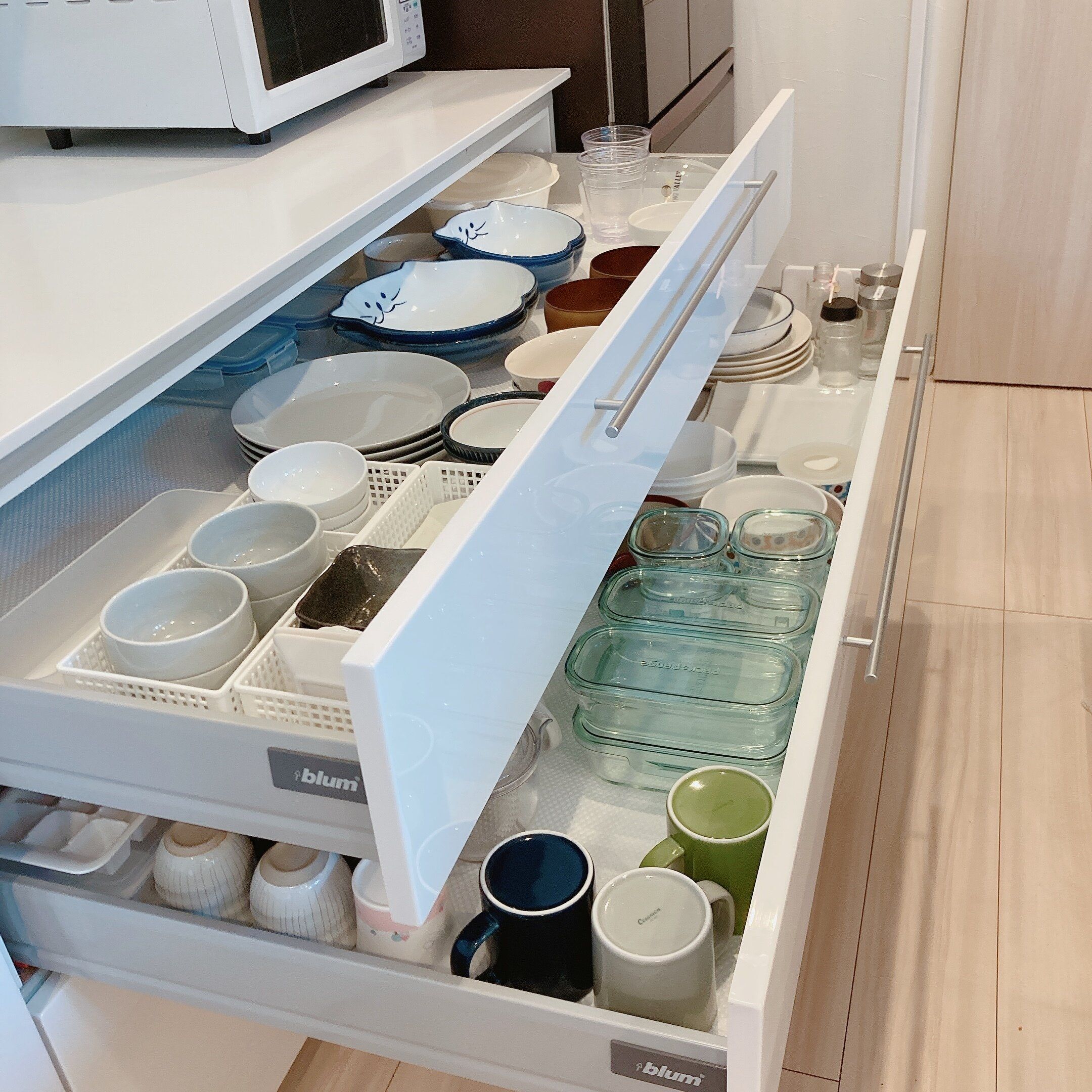 食器収納のコツは重ねすぎないこと。重ねすぎてしまうと下の方にあるお皿が取り出しにくい状態になってしまいます。収納スペースを増やしたい場合はコの字ラックを活用すれば、上の空間を活用できます。また食器棚の手前によく使う食器を、そして奥はあまり使わない食器を置くのがポイントです。