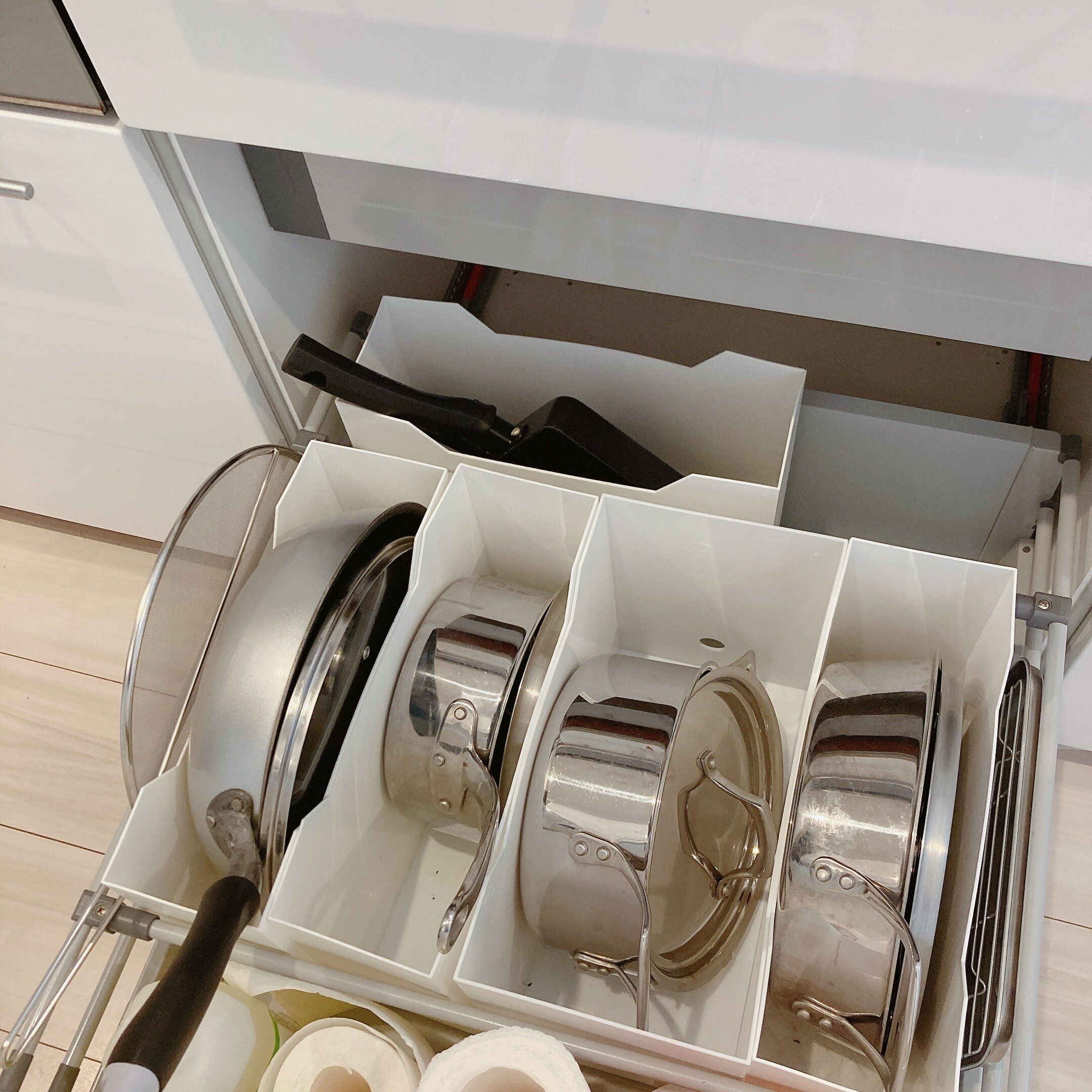 鍋やフライパンはできるだけ重ねずに収納することがコツ。引き出し収納であればファイルボックスに入れて立てて収納すれば取り出しやすくしまいやすくなります。調理も片づけもラクになるはずです。