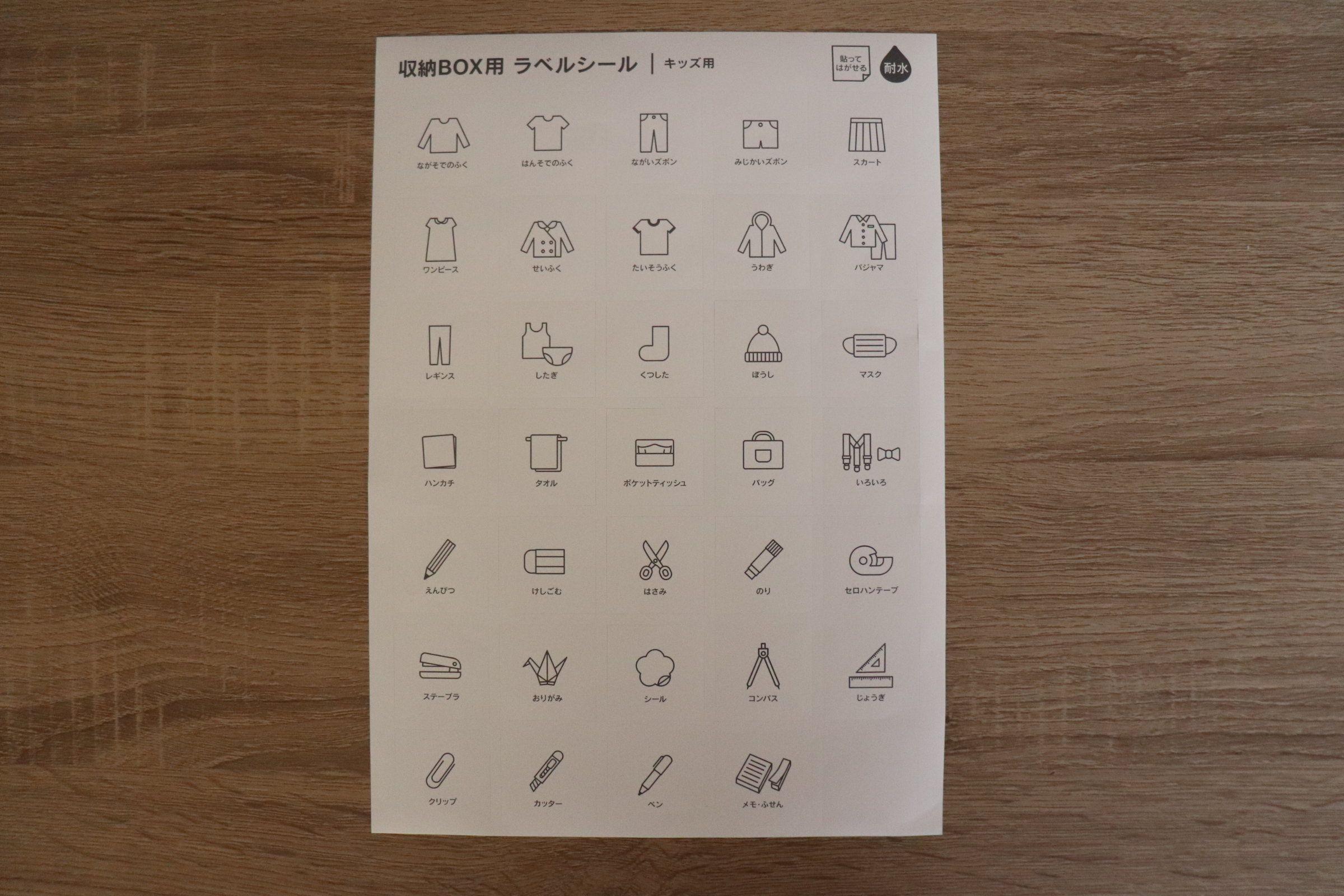 こちらはセリアで購入した「収納BOX用ラベルシール キッズ用」。アイコンと平仮名、カタカナで構成されているので小さな子どもでも分かりすいラベリングが可能。貼ってはがせるところや耐水なところもうれしい!