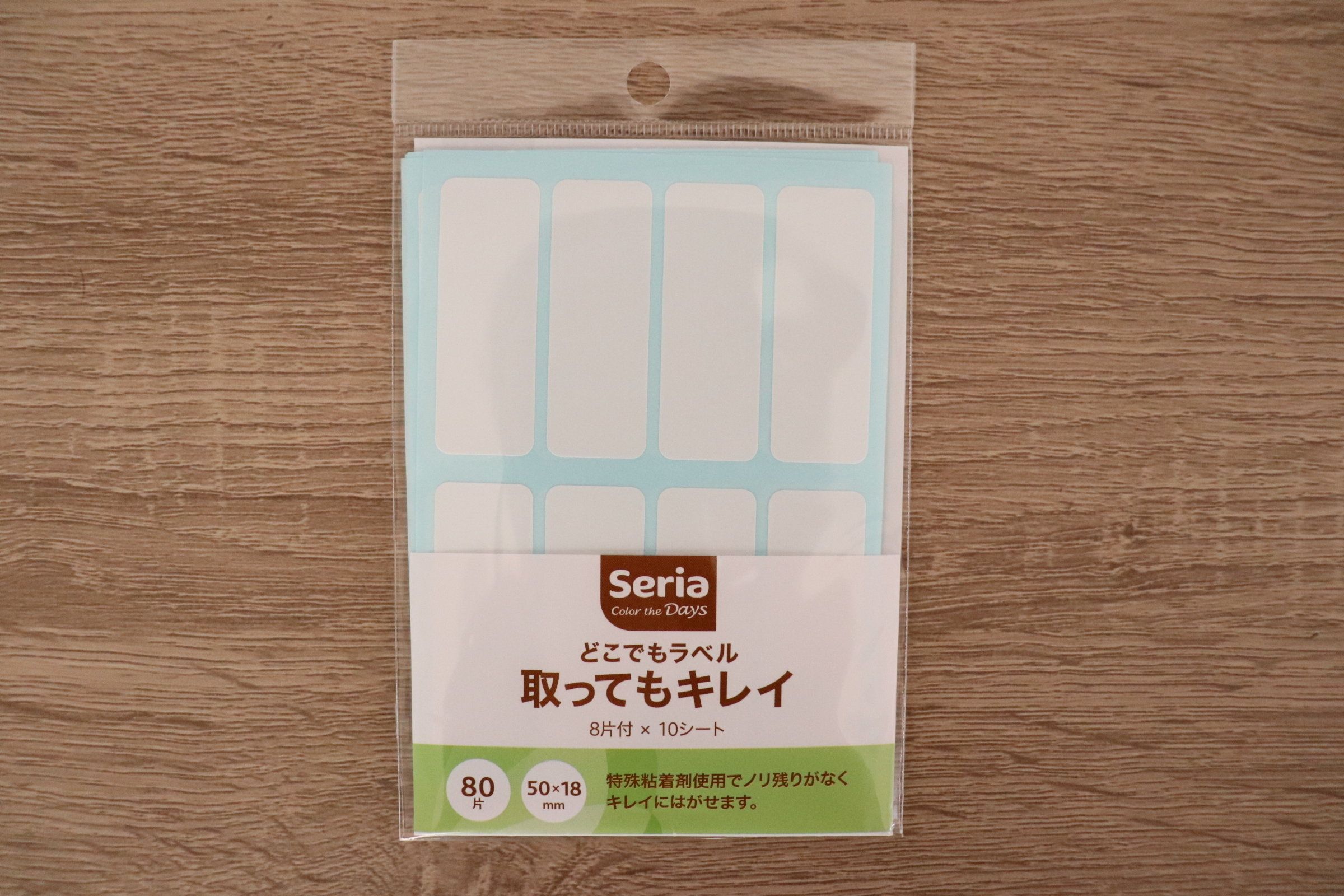こちらもセリアで発見した「どこでもラベル取ってもキレイ」。ここにラベリングしておきたいな……というときに、さっと書いてペタと貼るだけでラベリングの完成!特殊粘着剤使用で剥がすときにノリ残りが少ないところも高ポイント!1袋で80枚入りと大容量なのもうれしいですね。